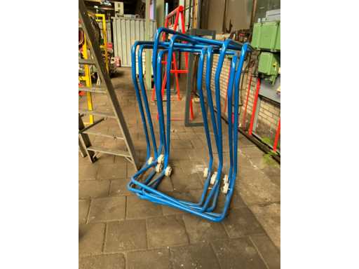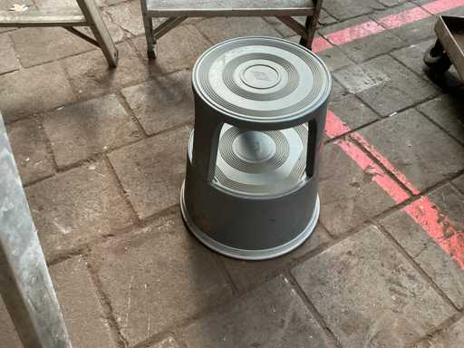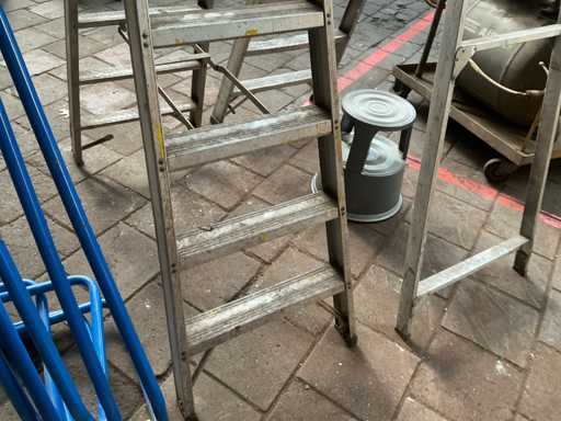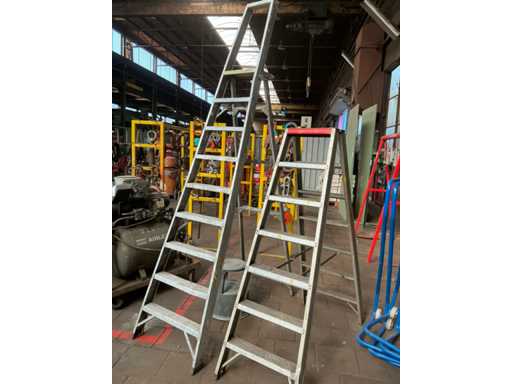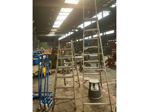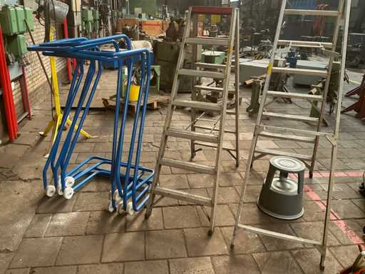 Dont 1x escabeau à 8 marches et 1x avec 2x 6 marches, dont 1 marche et 5 porte-sacs