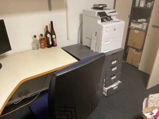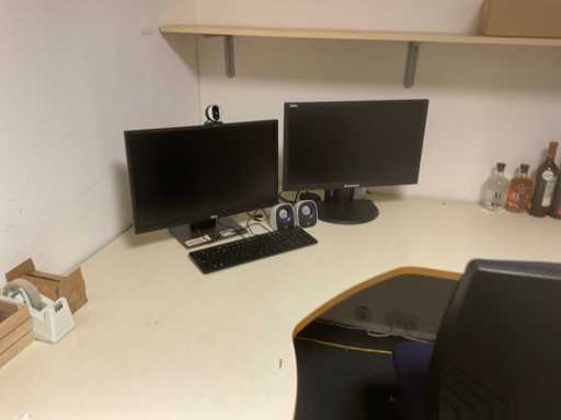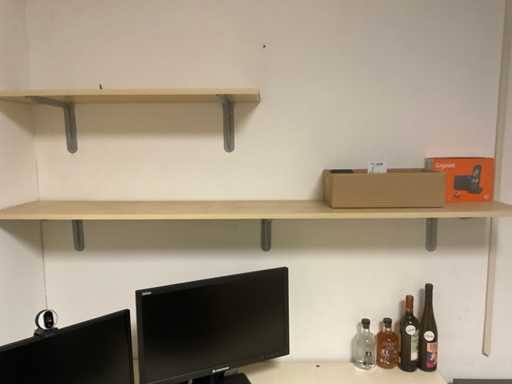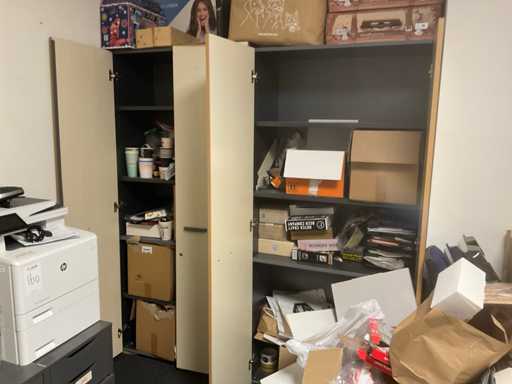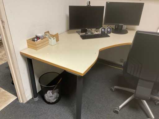 Composé d’un bureau d’angle, env. 160x160x75 cm, de 2 écrans, d’un clavier, d’une souris, d’une chaise de bureau, de 2 armoires à tiroirs et de 2 classeurs.