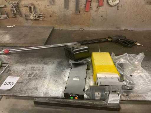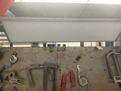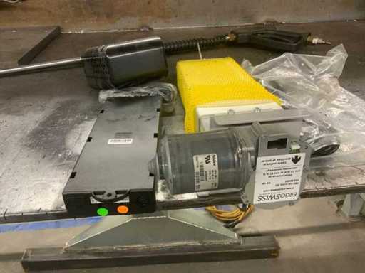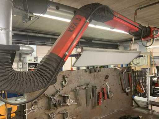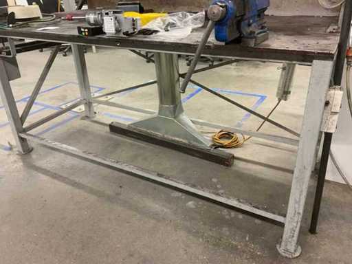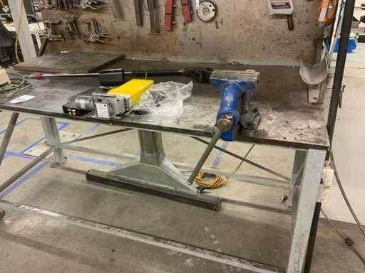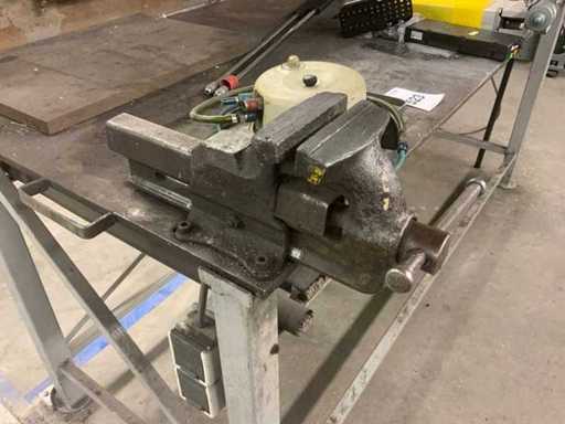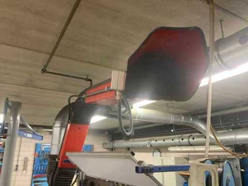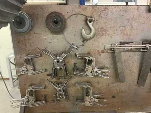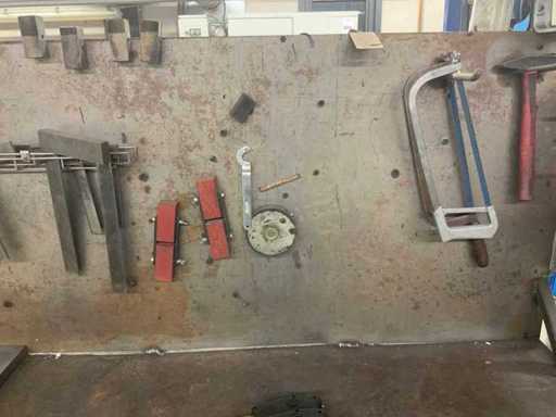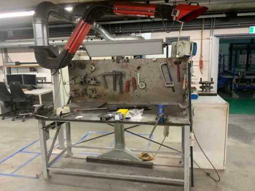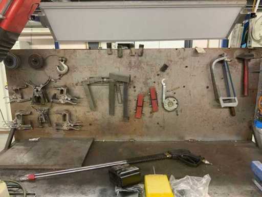 L’établi est équipé d’un mur arrière avec une lampe attenante et divers outils, tels que des serre-joints, des carrés et des scies. Deux étaux sont attachés à l’établi. Des pulvérisateurs haute pression et un système de levage de table Ergoswiss sont inclus. La hotte extractrice ne concerne que la partie rouge flexible jusqu’au tube en aluminium. L’acheteur doit apporter suffisamment d’outils pour le démontage.