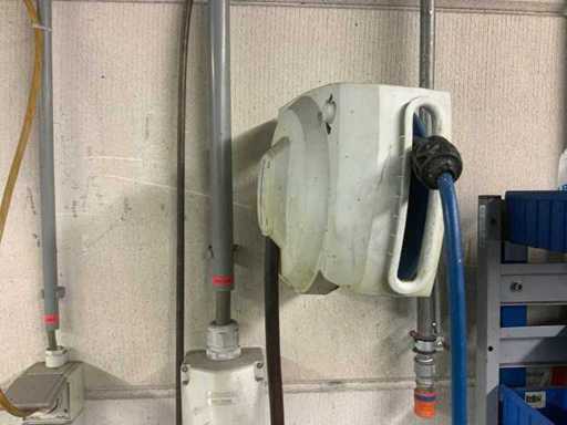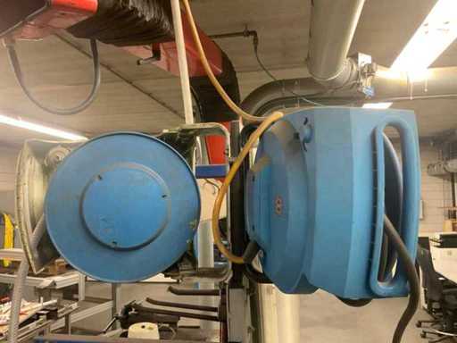Ce lot concerne un établi avec son contenu, une hotte extractrice rouge flexible et 3 bobines de tuyau d’air.