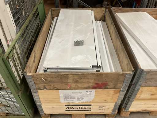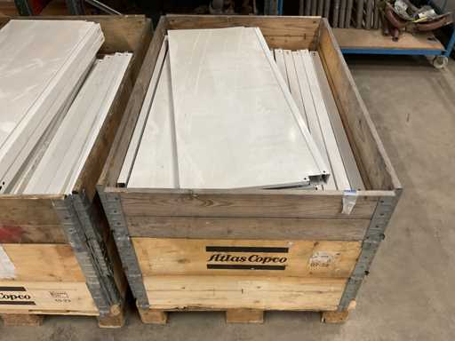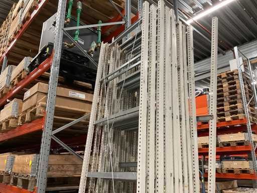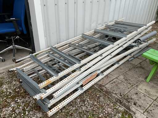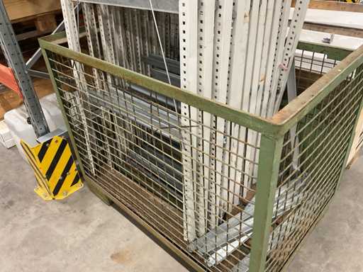 Composé de : 17x étrier, dim. CA. H292xL80cm et lot d’étagères, dim. env. L105xl40cm, hors Gitterbox et palettes avec bords de palette.