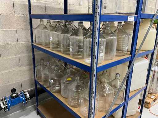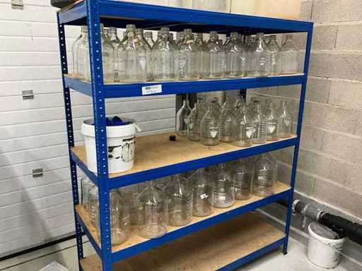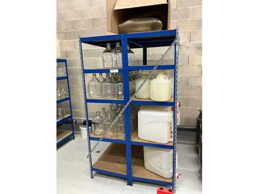 Lot de 2 rack étagère 60cm x 150cm x H 180cm et 120cm x 150cm x 180cm avec contenu de verrerie de laboratoire et bidons plastiques