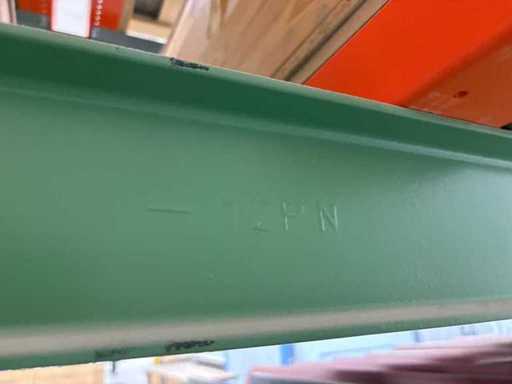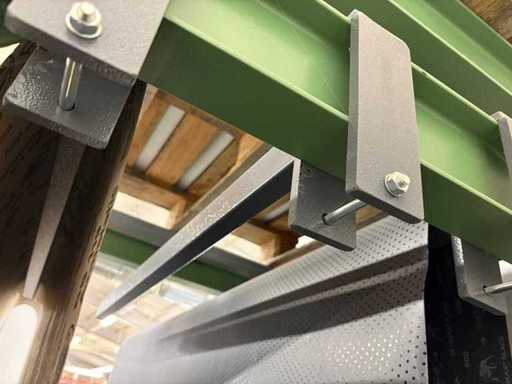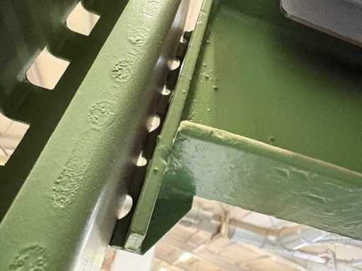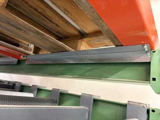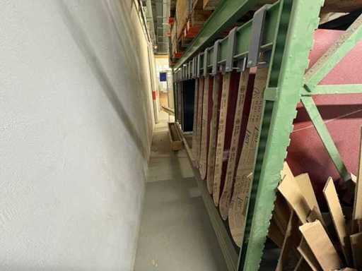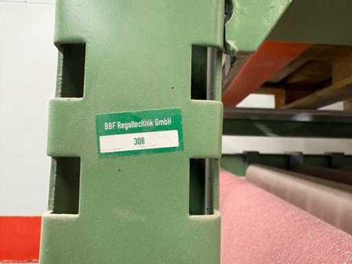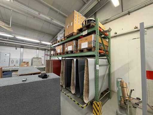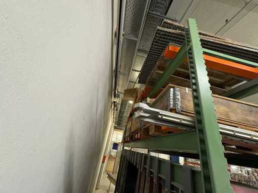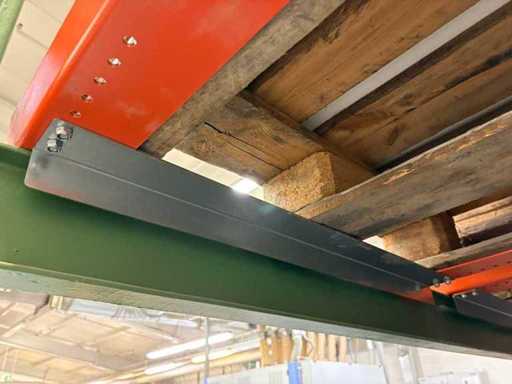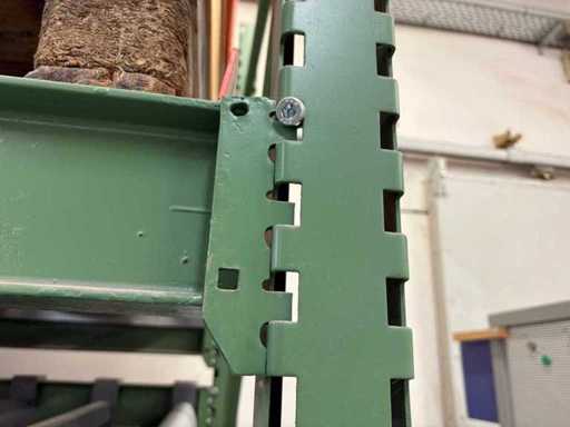 Étagère robuste composée de : 2 supports d’environ 1135x2860 mm, 7 fermes d’environ 4000 mm, incluant les supports à palettes, avec le contenu