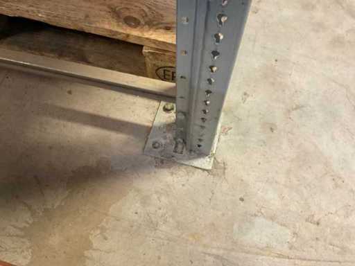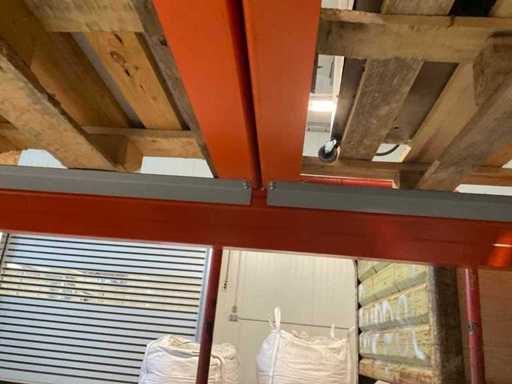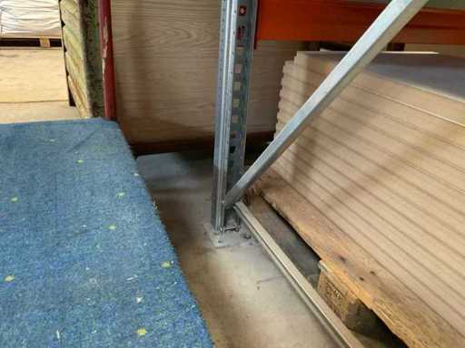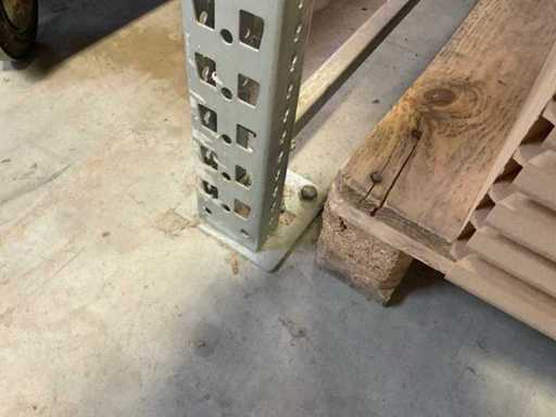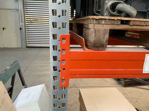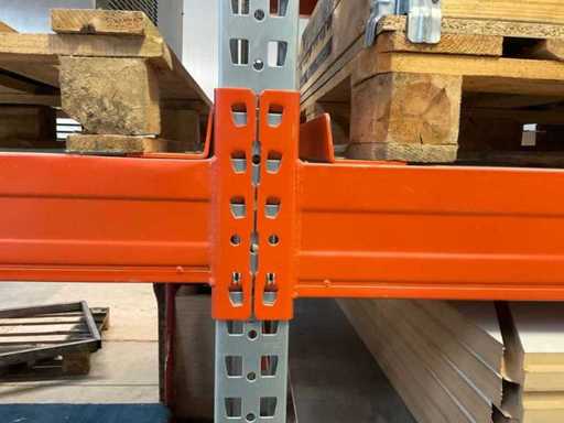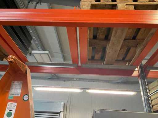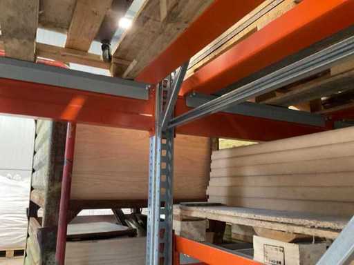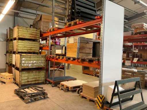 Étagère robuste composée de : 3 montants d’environ 1100x3300 mm, 12 fermes d’environ 3 600 mm, y compris les supports à palettes, avec leur contenu