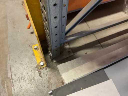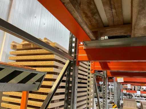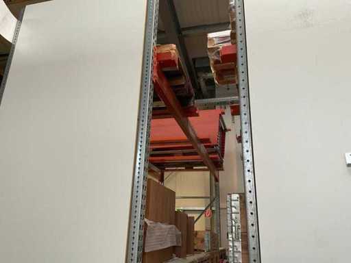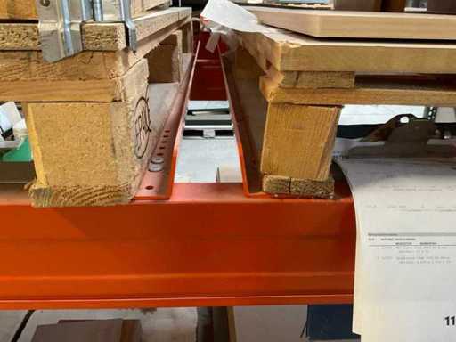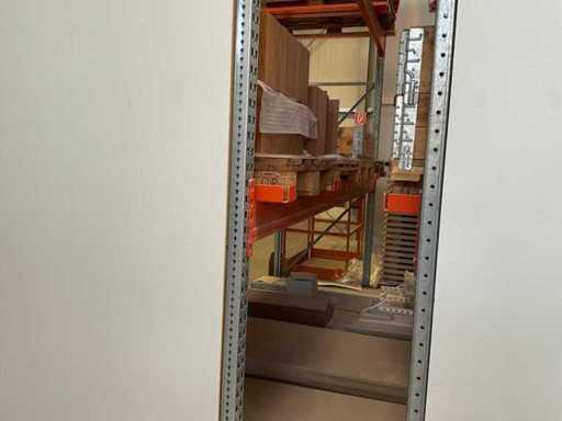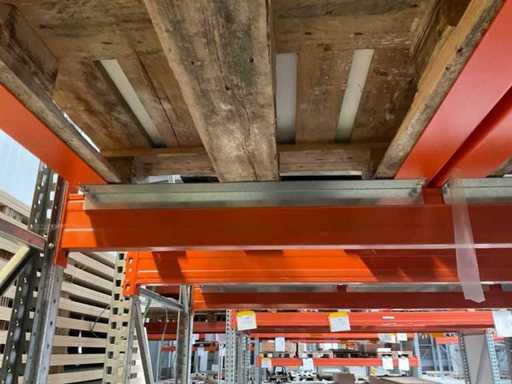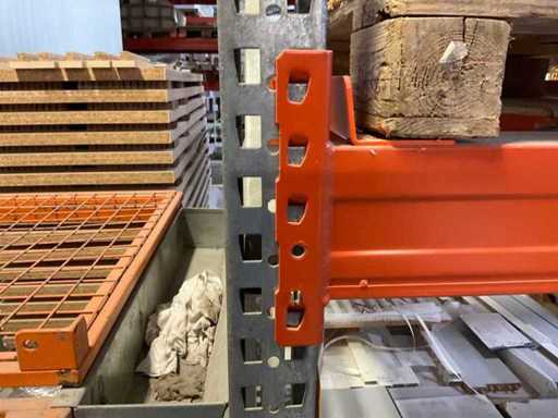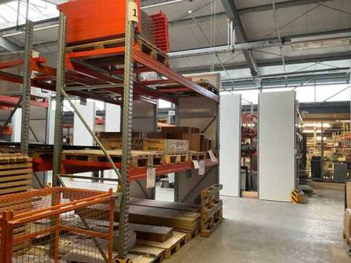 Étagère robuste composée de : 2 supports d’environ 1100x3300 mm, 4 fermes d’environ 3600 mm, y compris les supports à palettes, avec leur contenu