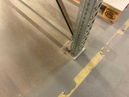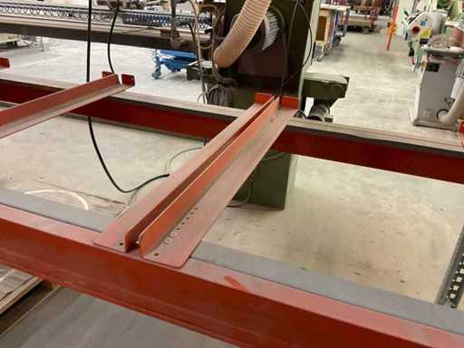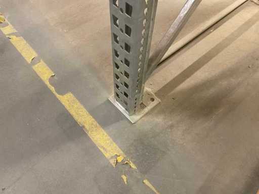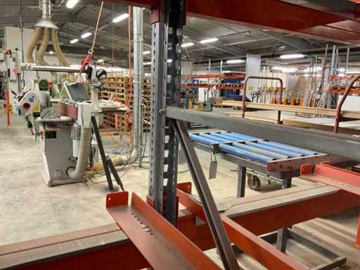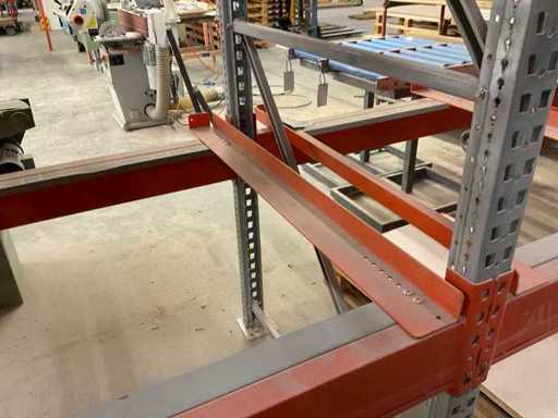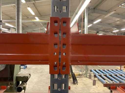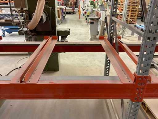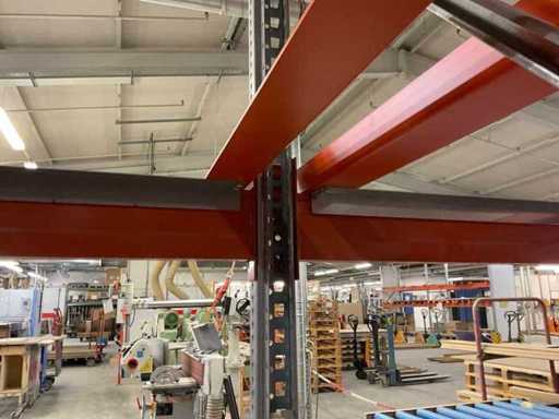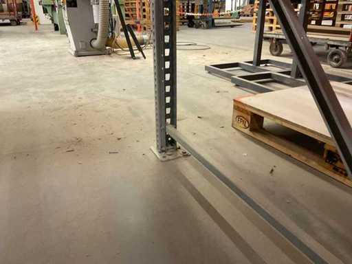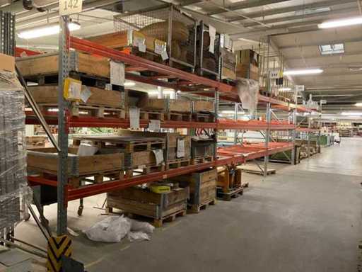Étagère robuste composée de : 4 supports d’environ 1100x3300 mm, 18 fermes d’environ 3600 mm, y compris les supports à palettes, avec le contenu