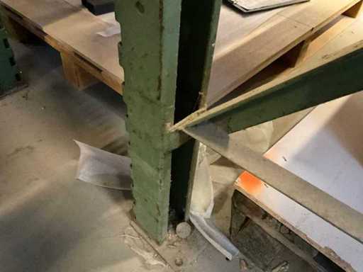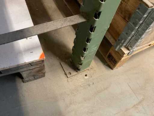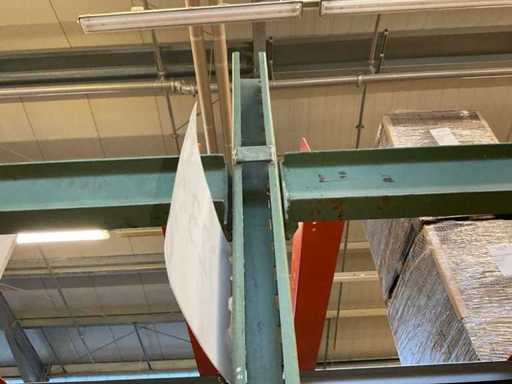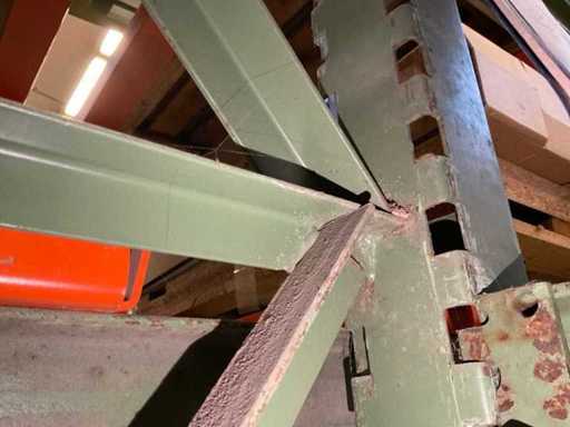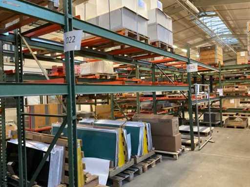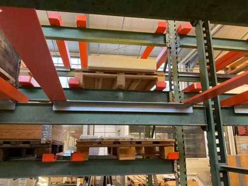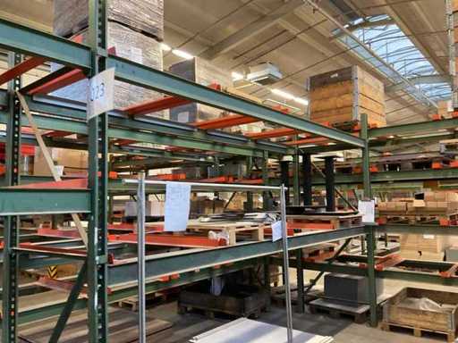 Étagère robuste composée de : 4 supports d’environ 1140x2900 mm, 12 fermes d’environ 4000 mm, y compris des supports à palettes, avec leur contenu