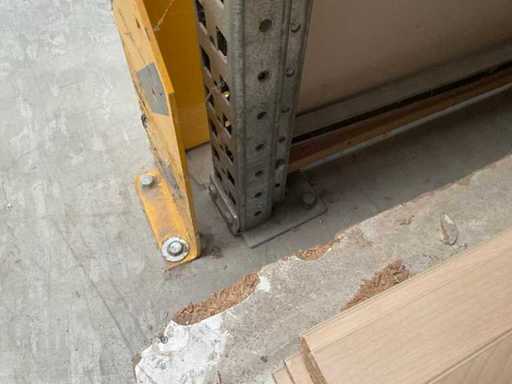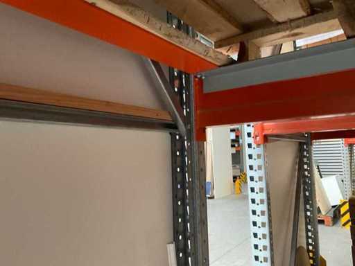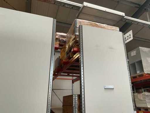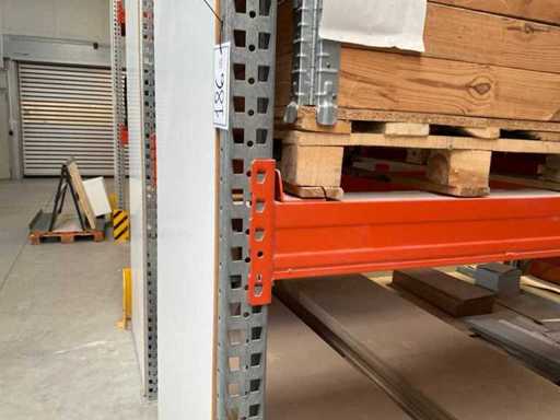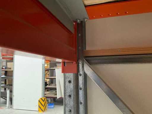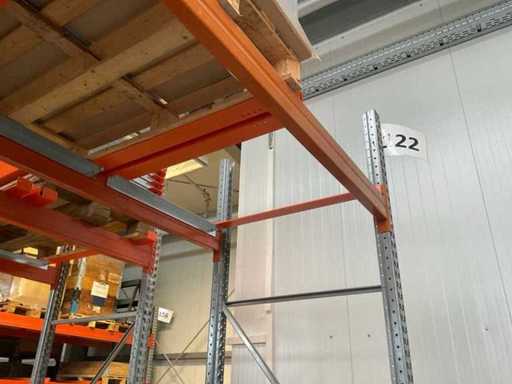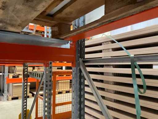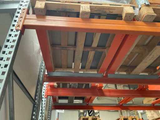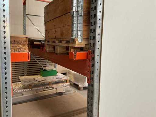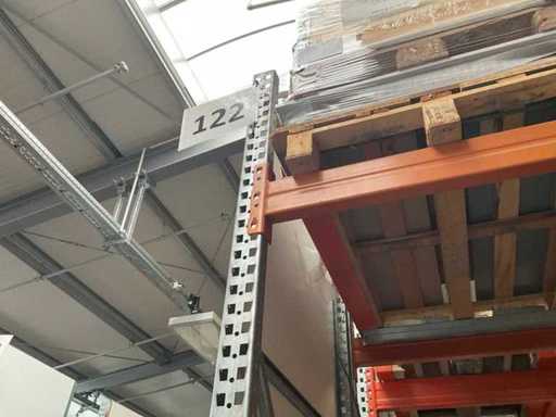 Étagère robuste composée de : 2 supports d’environ 1100x3300 mm, 4 fermes d’environ 3600 mm, y compris les supports à palettes, avec leur contenu