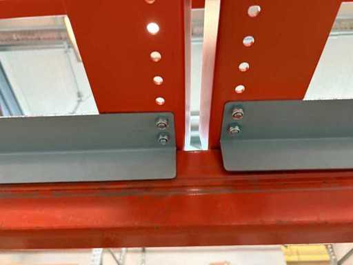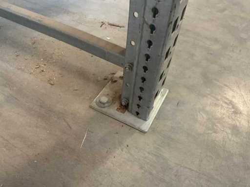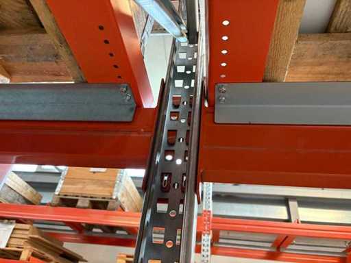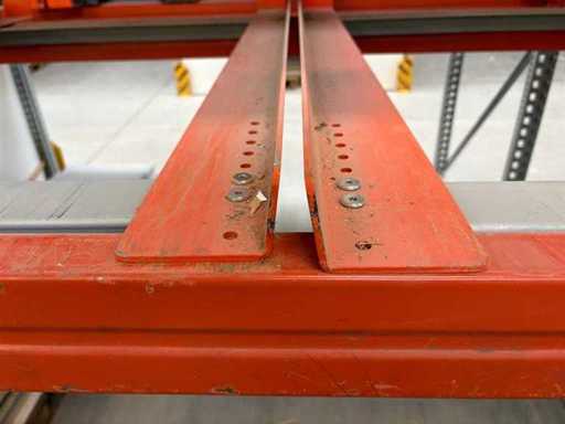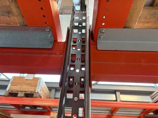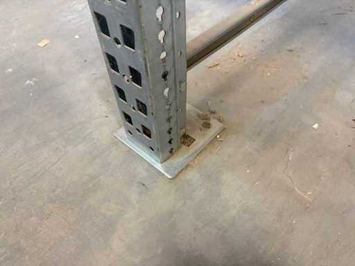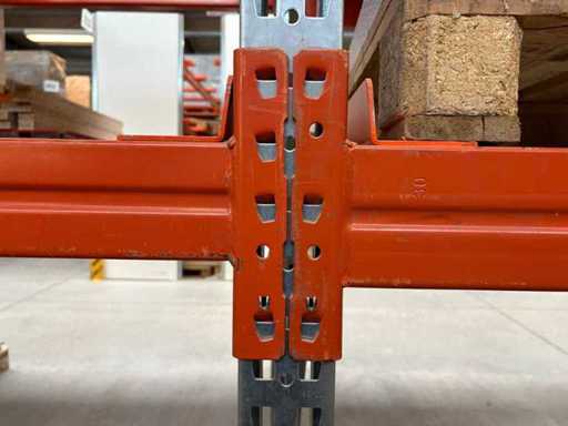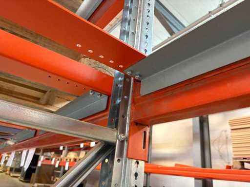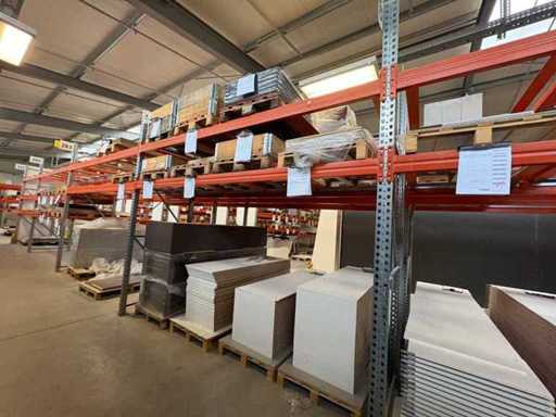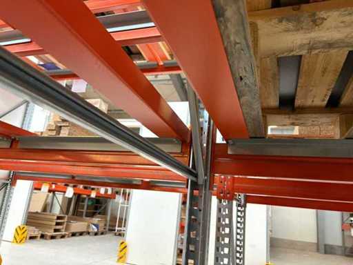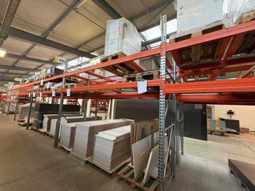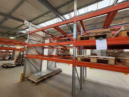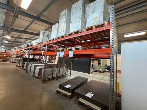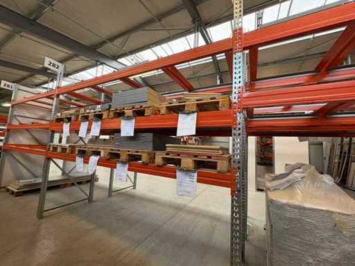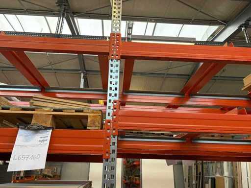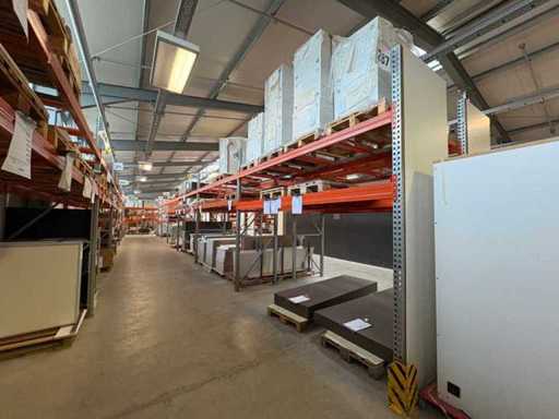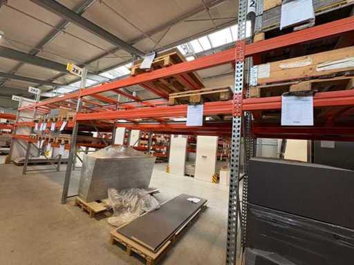 Étagère robuste composée de : 7 montants d’environ 1100x3300 mm, 6 poutres transversales d’environ 2700 mm, 22 poutres transversales d’environ 3 600 mm, y compris les supports à palettes, avec le contenu