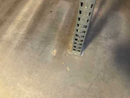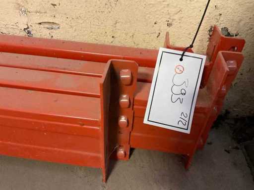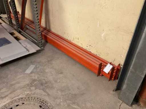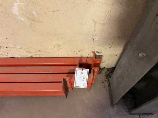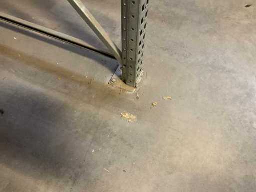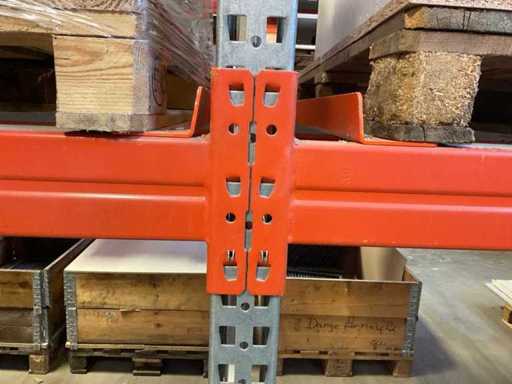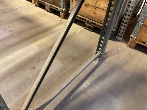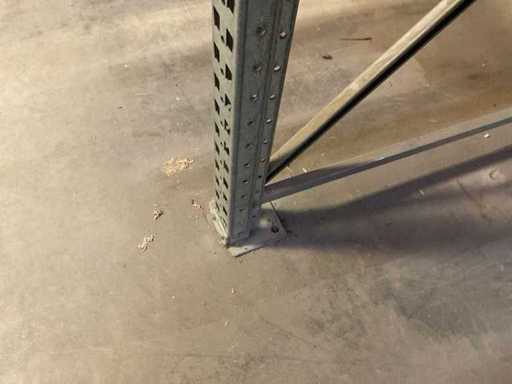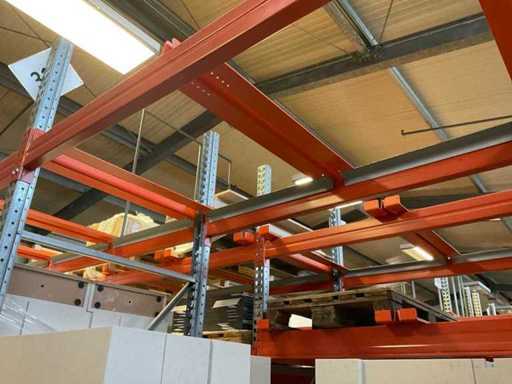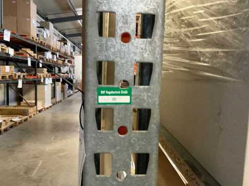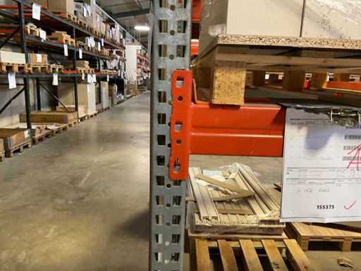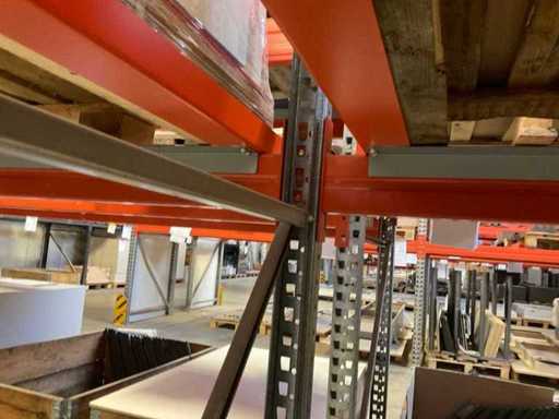 Étagère robuste composée de : 3 montants d’environ 1100x3300 mm, 12 fermes d’environ 3 600 mm, y compris les supports à palettes, avec leur contenu