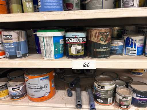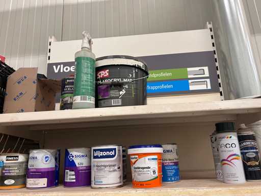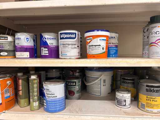 Le contenu comprend environ 60 canettes de peinture, dont Finess, Wijzonol et Sikkens