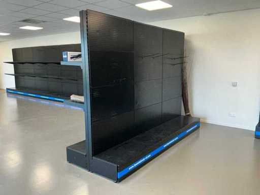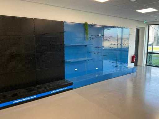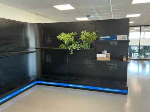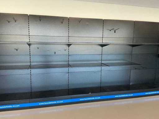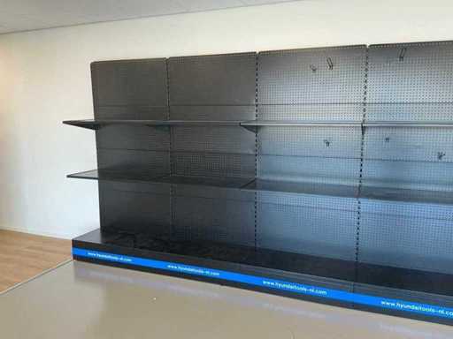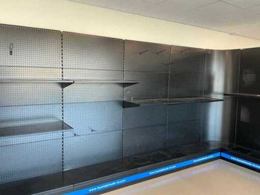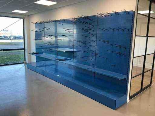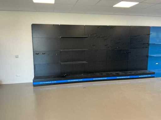 30 montants verticals, 29 sections avec 4 plaques murales par section. En partie avec des crochets, en partie avec des étagères.