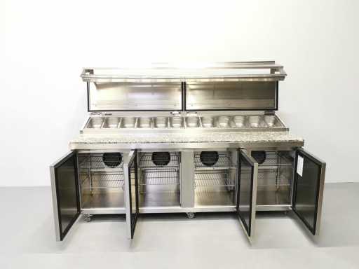 Équipé de plateaux en acier inoxydable, d’un plan de travail en marbre, d’une étagère supérieure et d’un espace de rangement supérieur