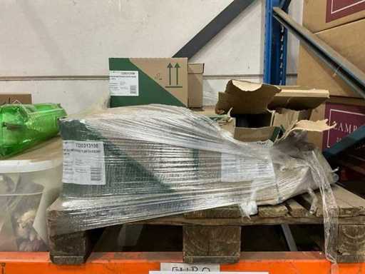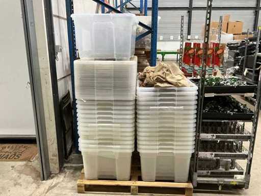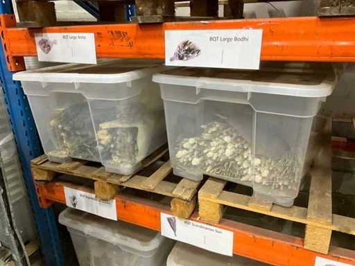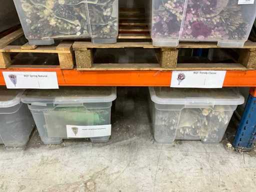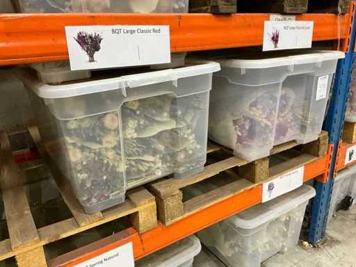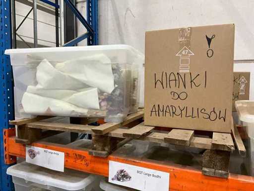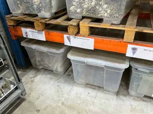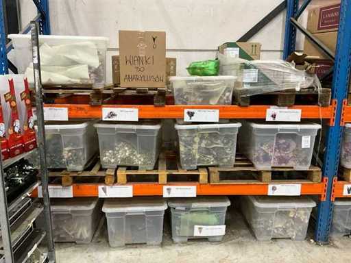 Concerne le contenu d’une section de rackage à palettes ; y compris des boîtes de rangement en plastique ; composé de différents types de