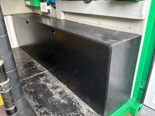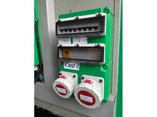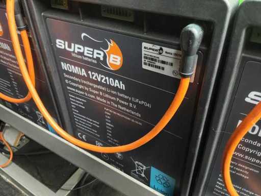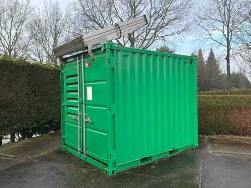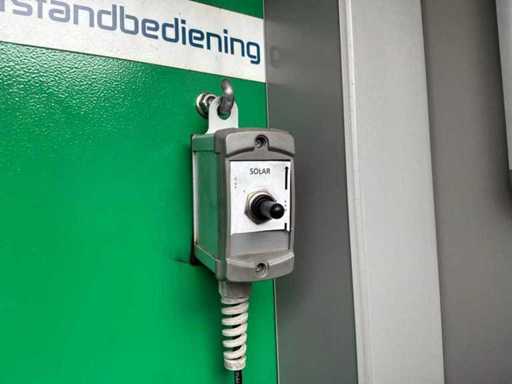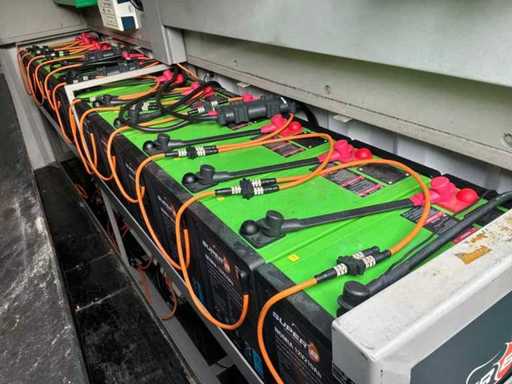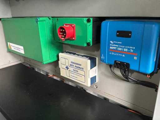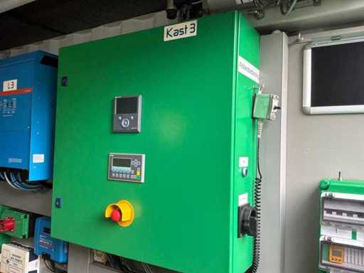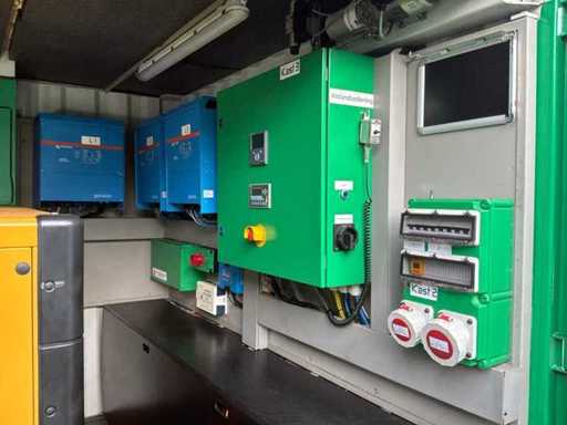 Intégré dans un conteneur équipé de panneaux solaires intégrés électriquement pliables, 3x onduleur/chargeur « Victron Energy » de type Quattro 48V/15000VA/200Amp, 1x contrôleur solaire intelligent « Victron Energy » de type MPPT150I85-Tr, boîtier de contrôle central avec contrôleurs numériques « Siemens » et « Victron Energy » et 12x batteries lithium « Super B » type Nomia 12V210Ah