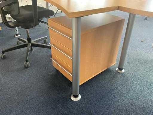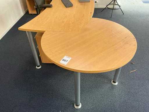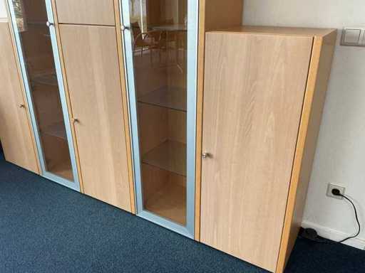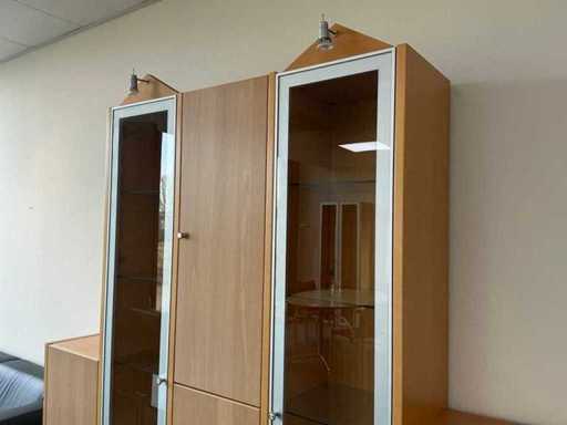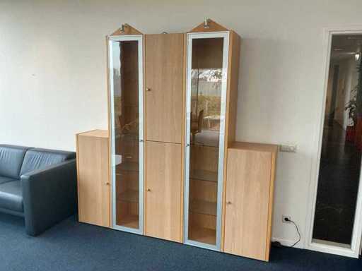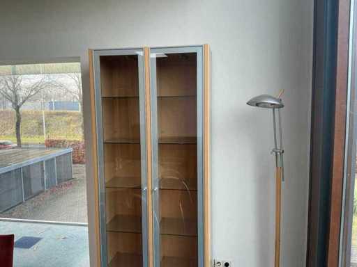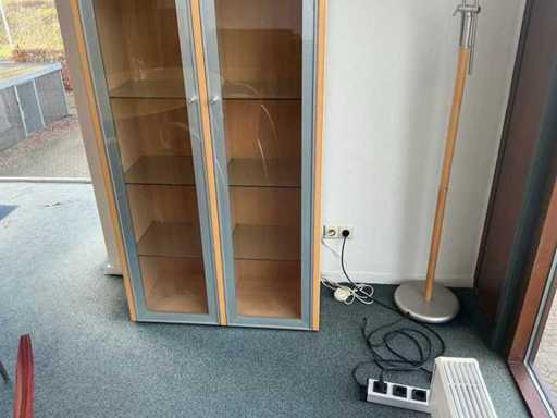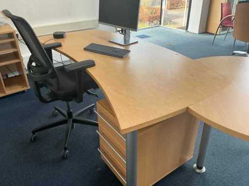 Composé d’un bureau exécutif 250x142x76cm, d’une chaise de bureau, d’un moniteur avec station d’amarrage, d’un meuble de rangement 80x50x80cm, d’un meuble mural 218x38x223cm, d’un meuble de rangement 89x39x212cm, d’un porte-manteaux, d’une lampe debout, d’un tableau blanc