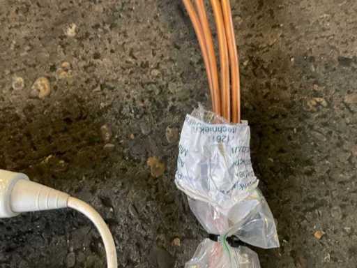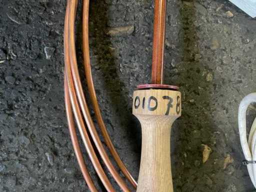 Goupille avec poignée en bois avec connexion d’alimentation, incluant tuyau en cuivre sur rouleau, diamètre extérieur d’environ 7 mm.
