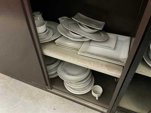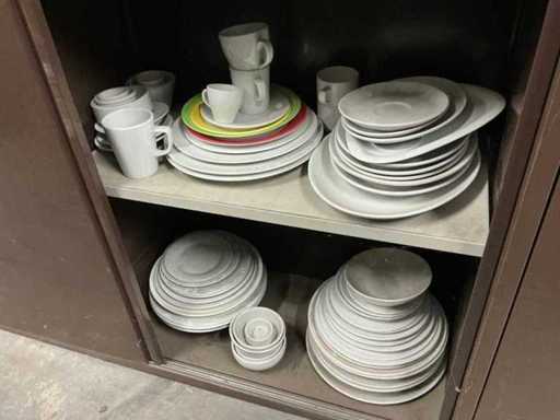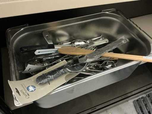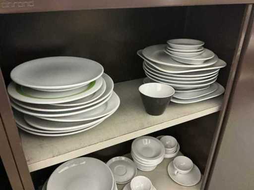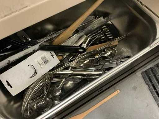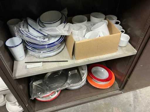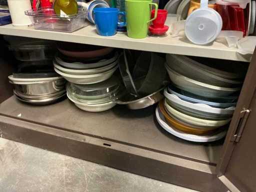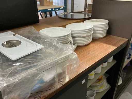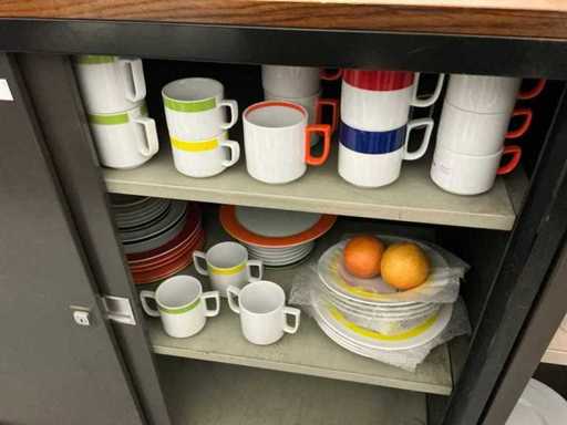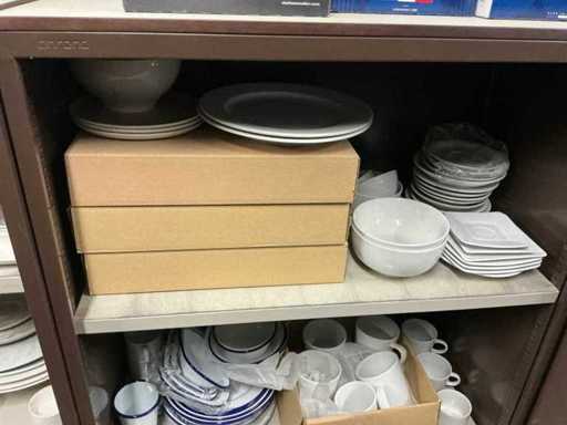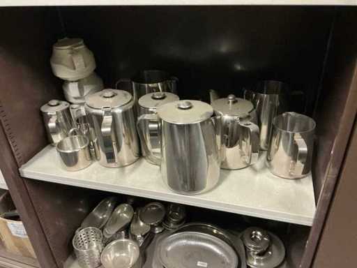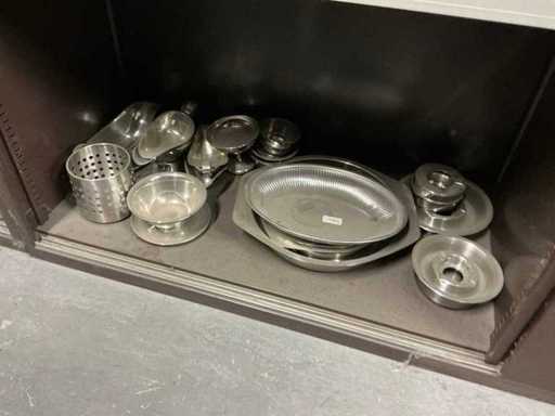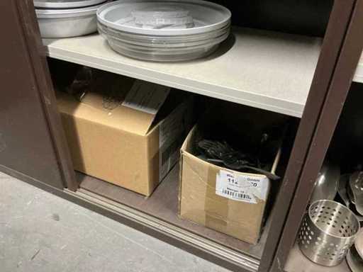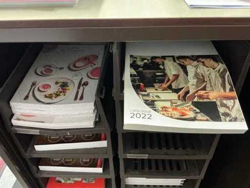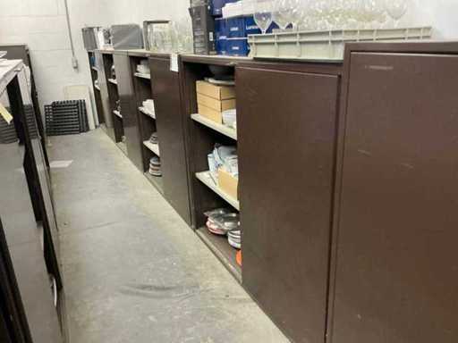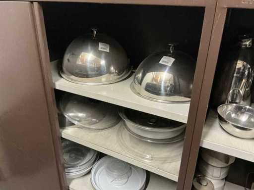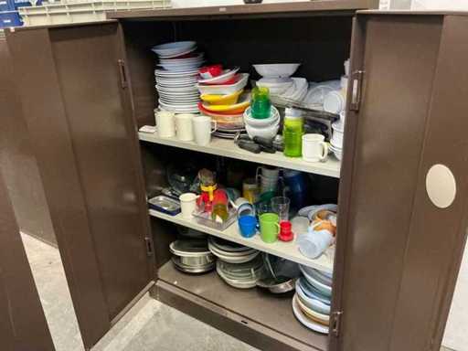 Incluant APS, Arthur Krupp, Luminarc, G.Benidict, C&S, Alfi,.., incluant des cruches isolées en acier inoxydable, des bols en acier inoxydable, des plats à gâteau en acier inoxydable de 26 à 28 cm, diverses planches à découper, divers ustensiles de cuisine tels que spatules, cuillères à sauce,.., différentes tasses, sous-verres, assiettes rondes, bols à soupe, bols, verres à vin,.., avec un lot de catalogues variés et 10 armoires en métal Ahrend dont les dimensions : 150x40x130 cm