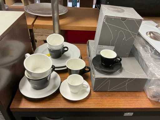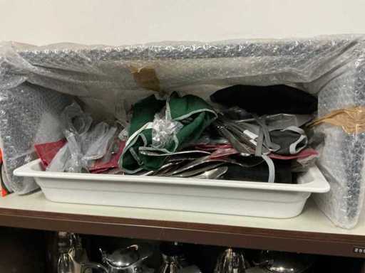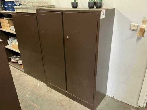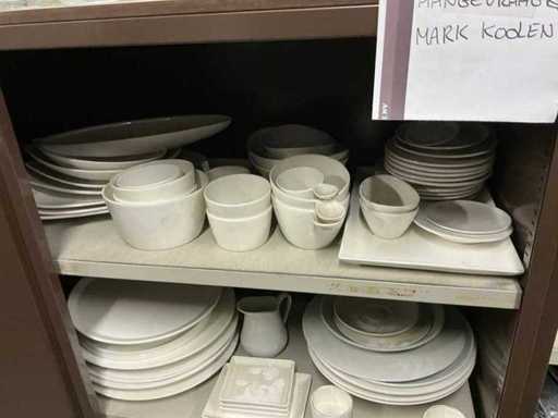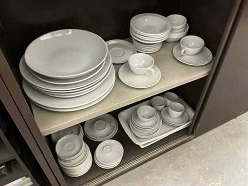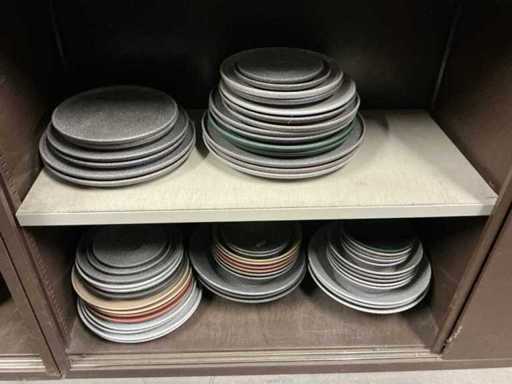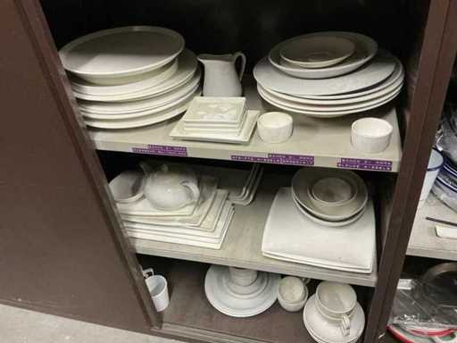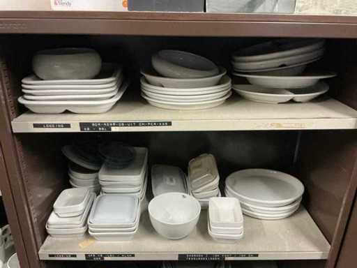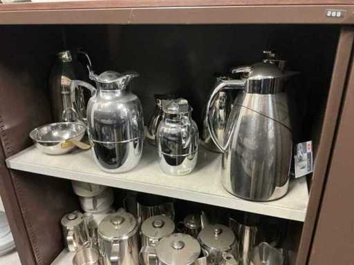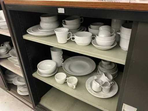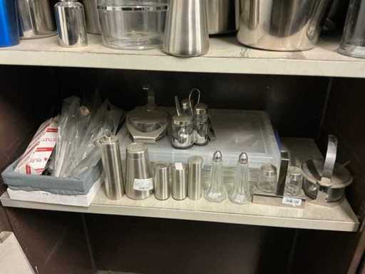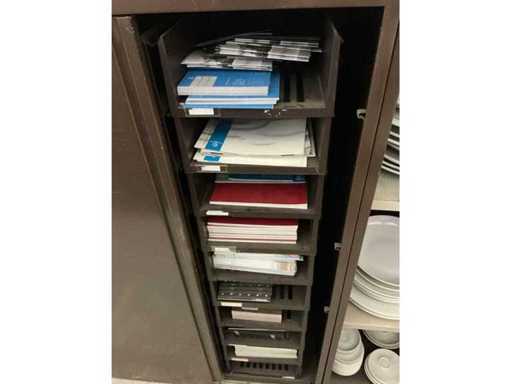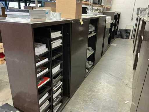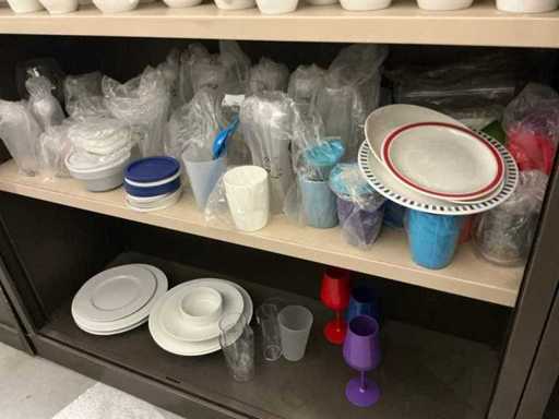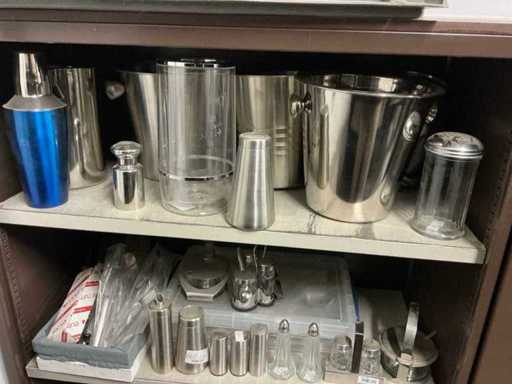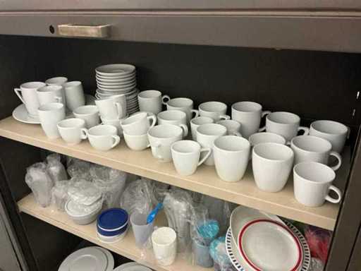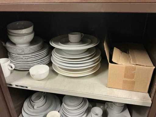 Incluant APS, Arthur Krupp, Luminarc, G.Benidict, C&S, Alfi,.., incluant des cruches isolées en acier inoxydable, des bols en acier inoxydable, des plats à gâteau en acier inoxydable de 26 à 28 cm, diverses planches à découper, divers ustensiles de cuisine tels que spatules, cuillères à sauce,.., différentes tasses, sous-verres, assiettes rondes, bols à soupe, bols, verres à vin,.., avec un lot de catalogues variés et 10 armoires en métal Ahrend dont les dimensions : 150x40x130 cm