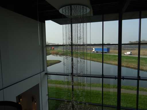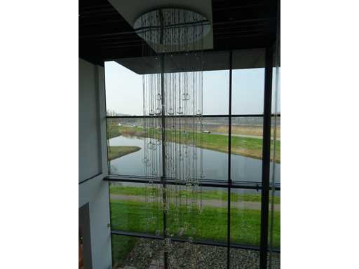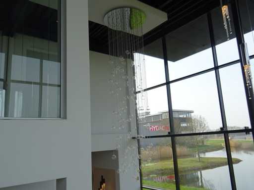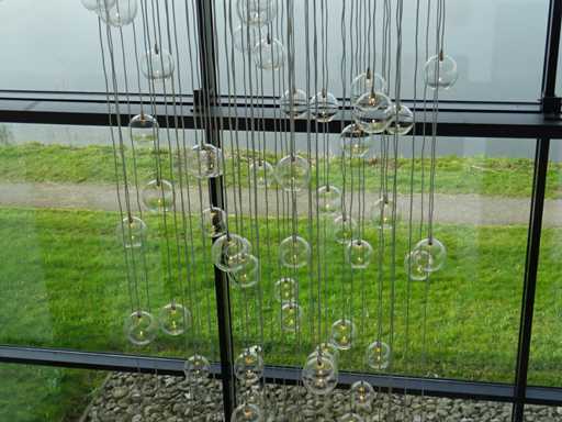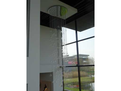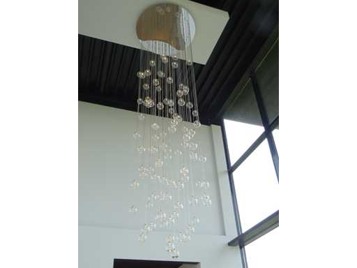 nombre de sources lumineuses : 100 ; 100 x boules en verre transparent avec module LED, plaque supérieure chromée +- 100 cm et diamètre de 120 cm, chute maximale de 5 mètres (hauteur réglable). Le terrain est suspendu à une hauteur d’environ 8 mètres