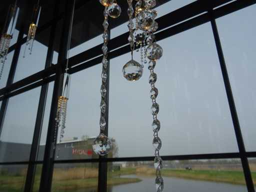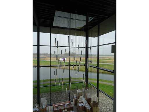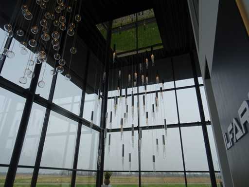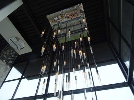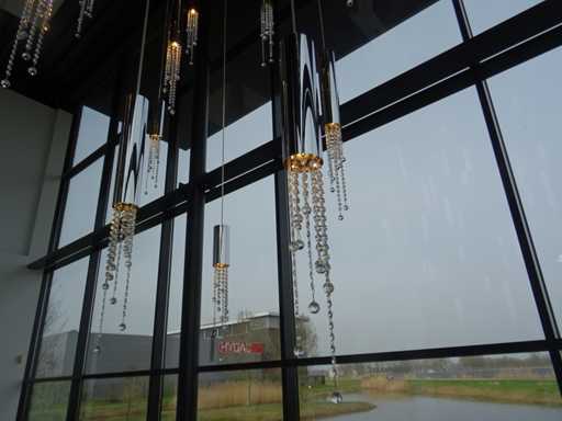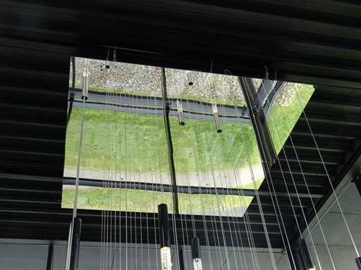 Nombre de sources lumineuses : 49 ; 49 tubes mixtes en 3 longueurs différentes (20, 30 et 40 cm), avec des cristaux Swarovski, avec une plaque supérieure de 200x200 cm (2 parties de 200x100 cm, couleur : chrome), déploiement maximal de 650 cm (hauteur réglable). Le terrain est suspendu à une hauteur d’environ 8 mètres