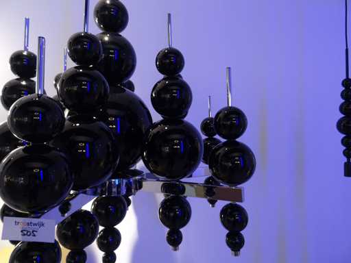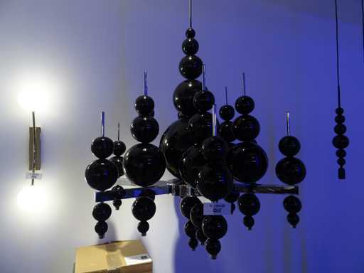 Couleur : Chrome, boules en verre noir ; Nombre de sources lumineuses : 12 ; Dimensions : 130x80cm (HxDia)