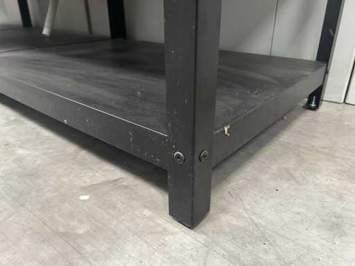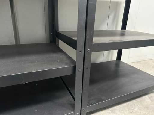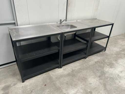 Ensemble de 3 îlots de cuisine modulaires à cadre métallique avec étagères ouvertes. Un module est équipé d’un robinet et d’un évier intégrés. (Les dimensions sont par îlot), avec des signes d’usure, l’état peut varier selon l’article.