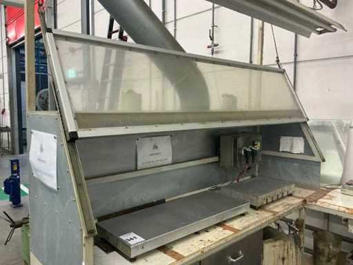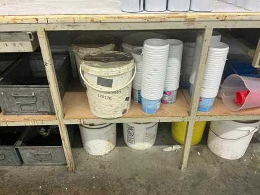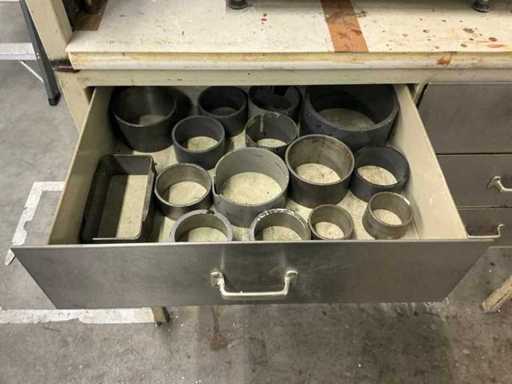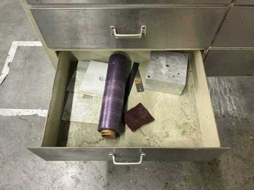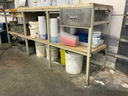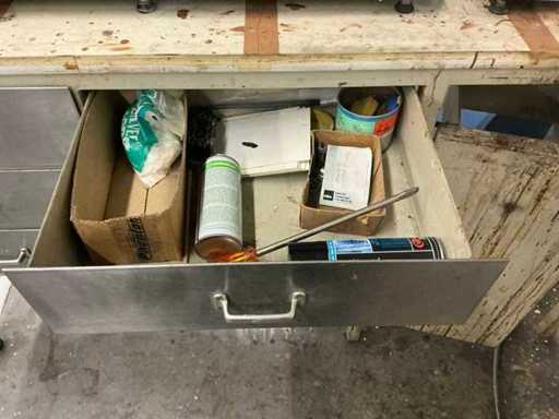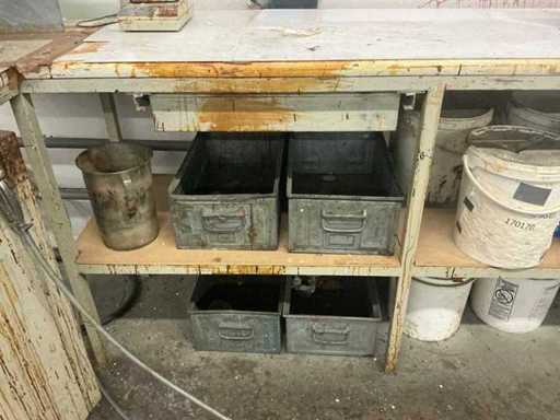 Cadre en acier avec dessus en bois, le contenu appartient au lot. Les articles séparément en lot ne font pas partie du lot