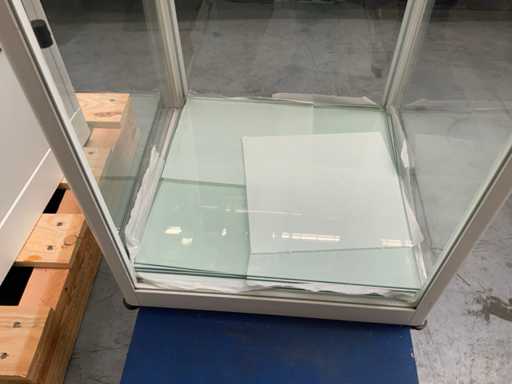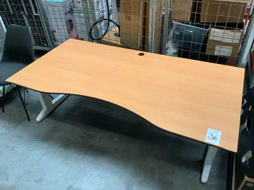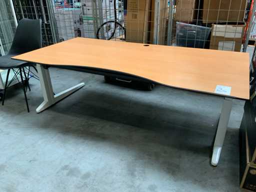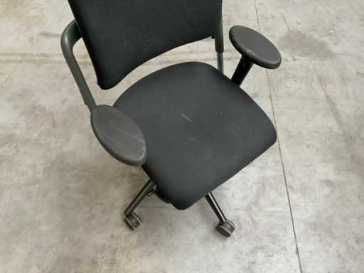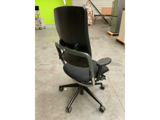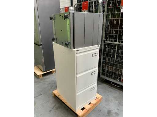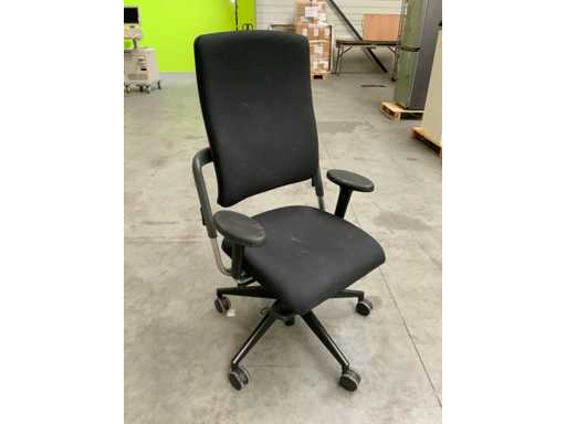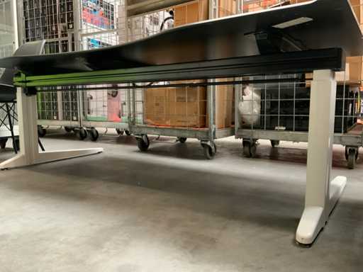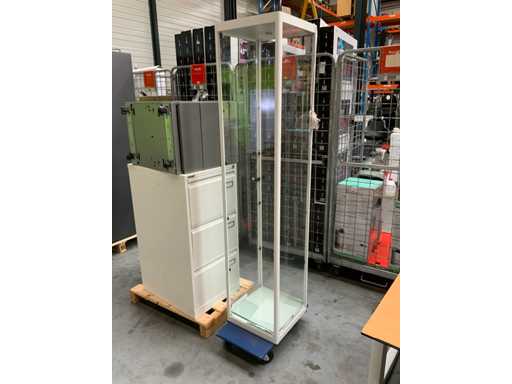 Composé de : Bureau ventral, équipé d’un plateau en bois et d’un cadre en acier, réglable en hauteur, dimension env. : 1800x900 mm (la rabattable est lâche), 1x chaise de bureau Xenium, rembourrée noire, 1x chaise, 1x vitrine, équipée d’un éclairage, dimension env. : 400x400x1800 mm, 1x commode Bisley, dimension env. : 470x620x1020mm et 1x bloc-tiroirs Ahrend, dimension env. : 440x570x530 mm.