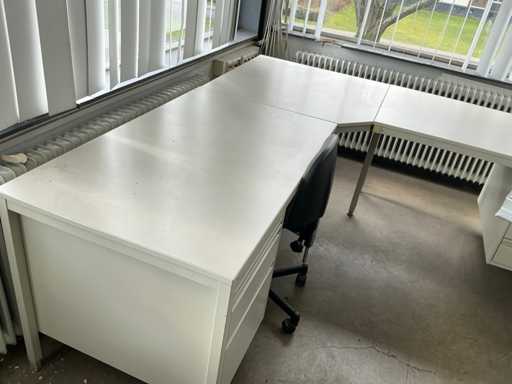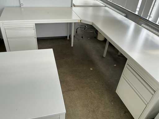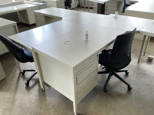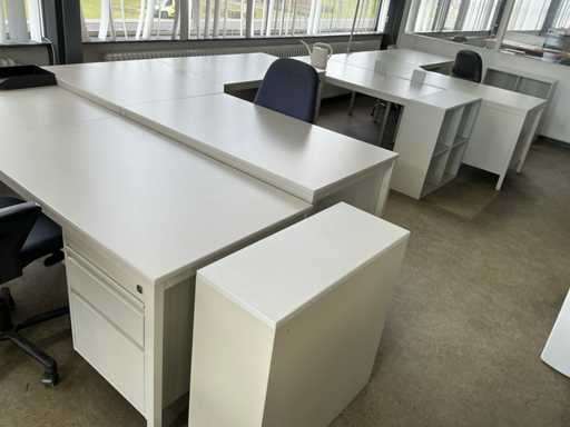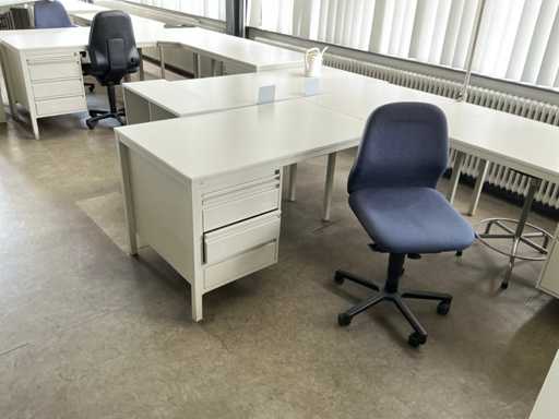 Composé de 11 chaises différentes, 2x classeur modèle haut, 4 classeurs modèle bas, 3x tables de bureau et 12x bureau en forme de L, dont 9x taille 2150x2150mm et 3x taille 2000x2000mm., le tout sans aucun sur ou contenu.