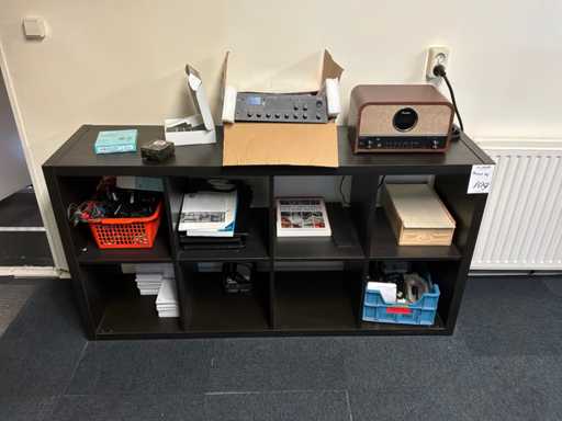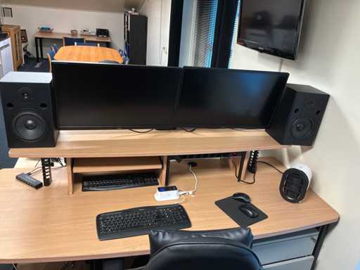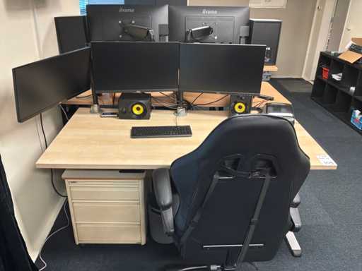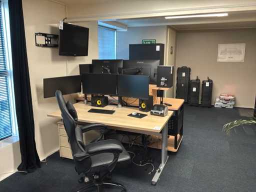 Incluant : 5 moniteur iiyama, 4 enceintes Vonyx, 1 télévision Samsung avec support en v, 2 chaises de bureau, 1 classeur, 1 compartiment, 1 chauffage au gaz, 1 étagères, 2 bureaux avec commode et câblage ICT, 1 plante d’intérieur.