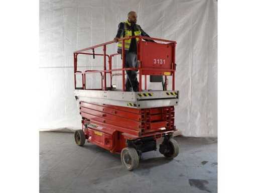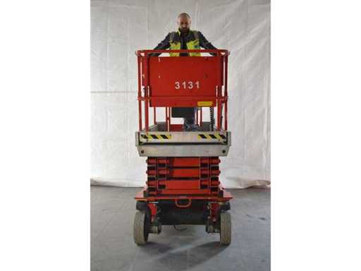 N° intérieur 3131, garde au sol 0,13 m, capacité de levage sur extension 120 kg, longueur de la plateforme allongée de 3,73 m, hauteur de transport sans rampe de 1,92 m, pneus blancs, points d’attache pour systèmes de retenue (EPI) disponibles.