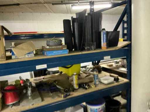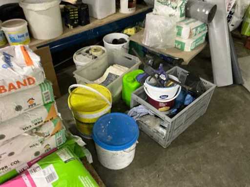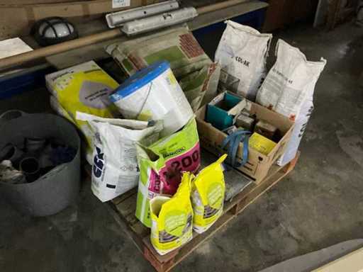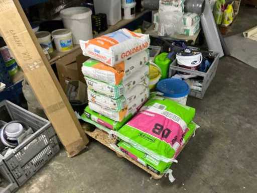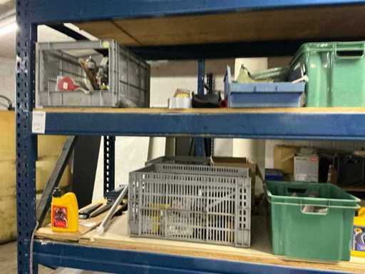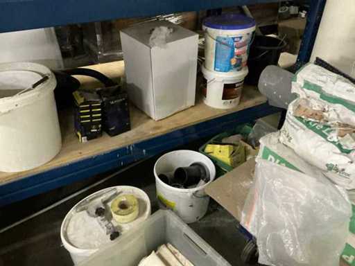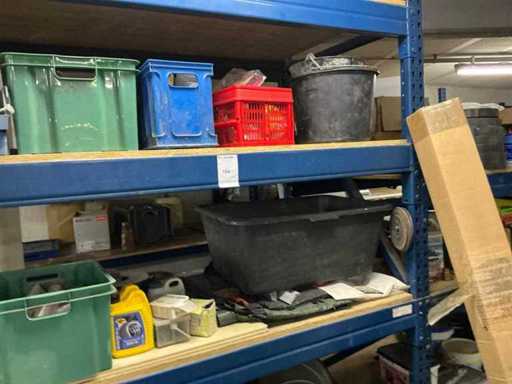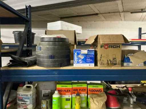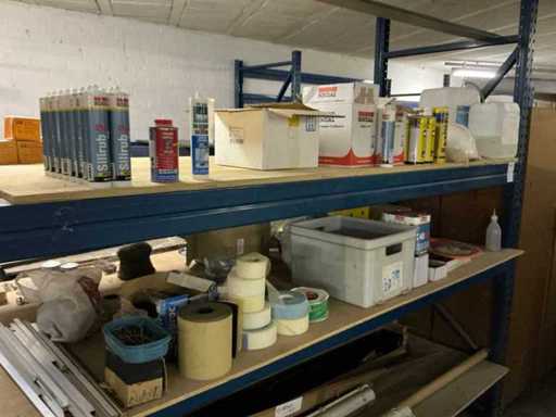 y compris les silicones, les colles, le ruban adhésif, les produits en mortier, les raccords de tuyau, .... étant le contenu du rack, y compris un rack avec 4 montants de 100xH250cm et 20 poutres de 270cm