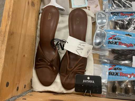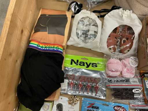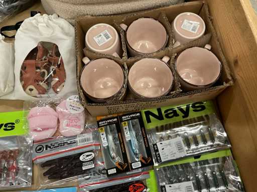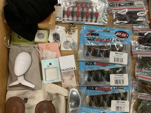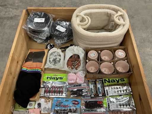 y compris des articles de pêche, des bijoux, des chaussures de femme, des boxers, des paniers de rangement, des chaussures pour enfants, etc.