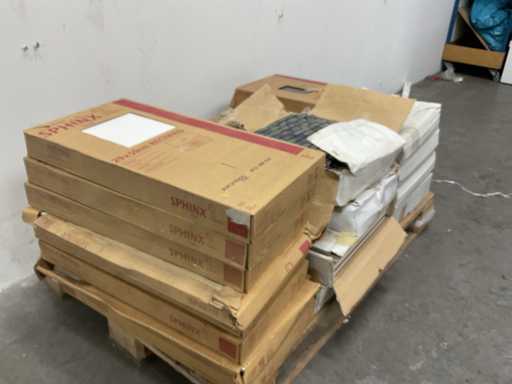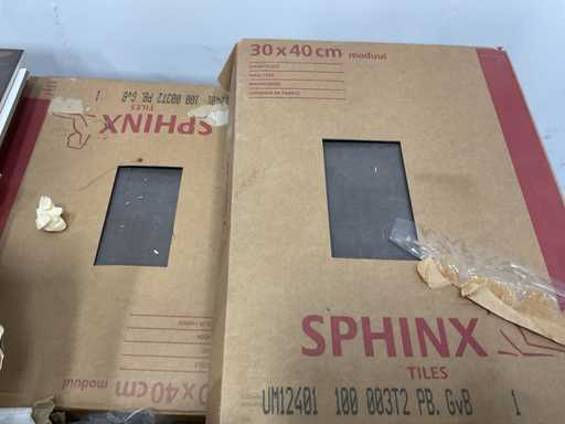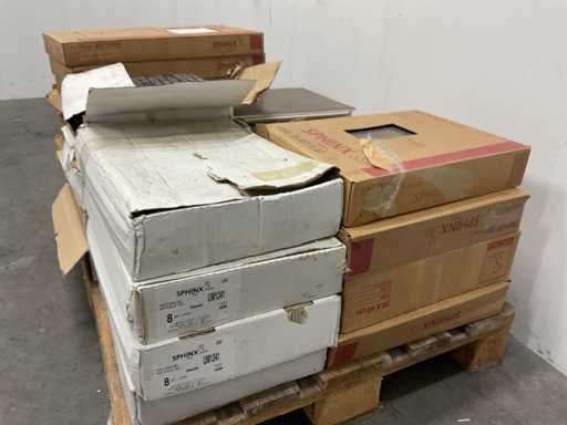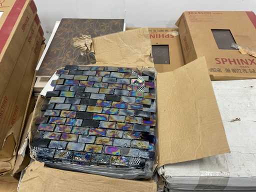 14 colis scellés. + 3 packs ouverts. 7 boîtes de carreaux 29x59cm. Différentes couleurs.