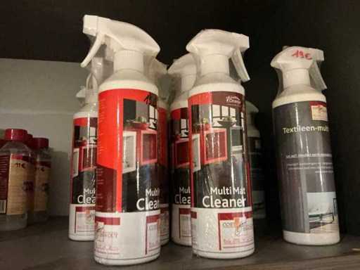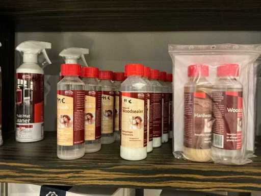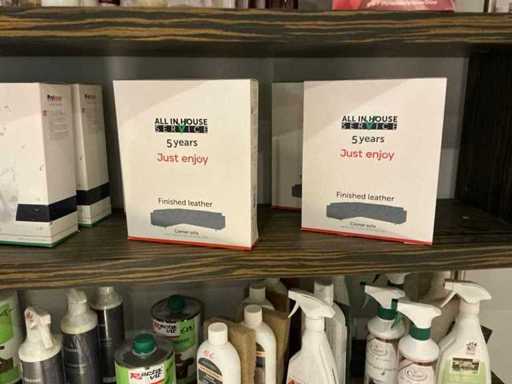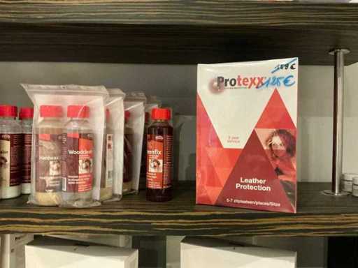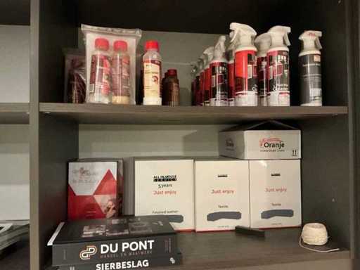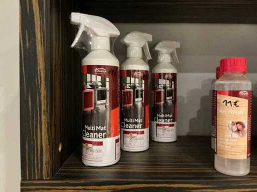 Incluant BBCASUAL, RECTAVIT, PROTEXX, ORANGE, y compris huile d’imprégnation, multinettoyeur, nettoyant pour bois, nettoyant textile et cuir, tecrenovator, reposant dans deux armoires différentes distribuant selon les instructions