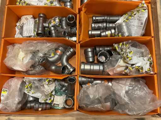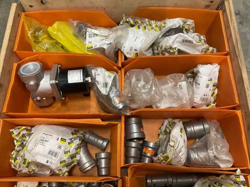 - o.a. Viega persfittingen, Elektrogas VMR6-2 gasmagneetklep, etc., incl. kunststof magazijnbakken.