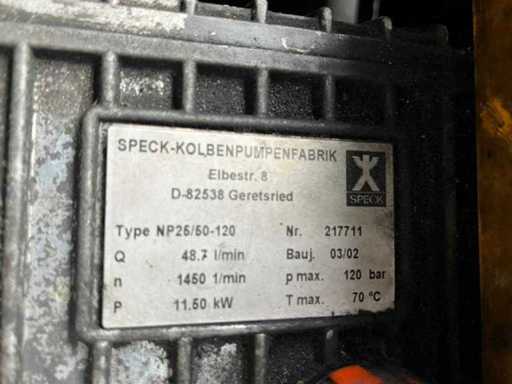 Pompe Speck NP25 140 bars, 50 l/min ; moteur diesel Kubota ; heures de lecture : 13h27 ; réservoir d’eau de 600 lb ; Environ 60 m de tuyau HD avec lance, 2 buses, testé en état de marche
