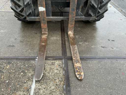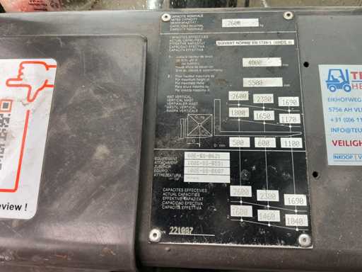 4RM, fourches 1200mm, planche à cuillère 1500mm, mât triple, œil de remorquage à l’arrière, hauteur de levage maximale 5500mm, capacité maximale de levage 2600kg, les autocollants publicitaires seront retirés lors de la vente