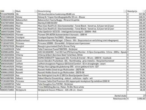 Il s’agit d’un lot de produits retournés de la marque A provenant d’un grand détaillant en ligne. Le lot se compose de différentes catégories de produits. Nombre de pièces : 27. Valeur de détail : 3 092 € Non contrôlé : exploitation inconnue (mélange de