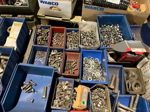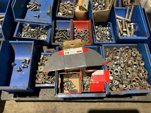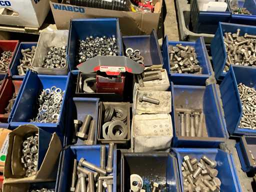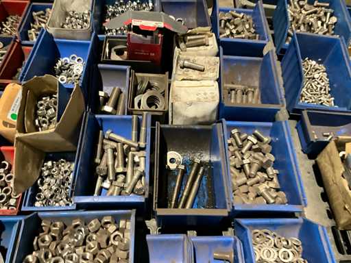 composé de différentes tailles de boulons à 6 côtés et enrobés, d’écrous (y compris auto-verrouillants), dans des bacs à pince sur et avec 1 palette