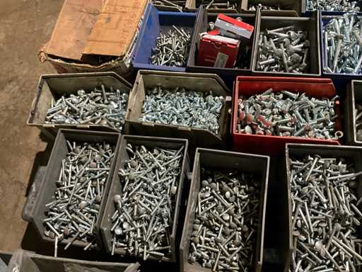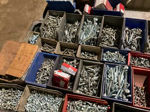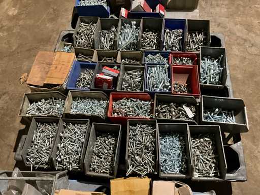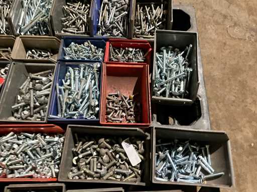 Divers boulons de chariot dans des bacs de stock, tous sur et avec une seule palette