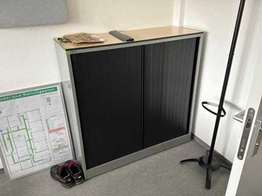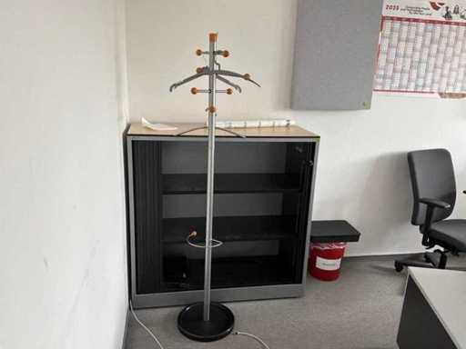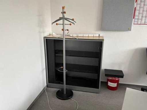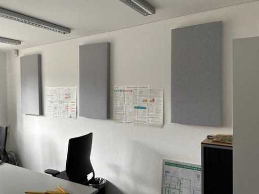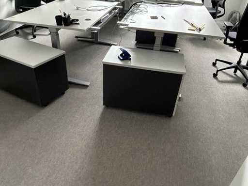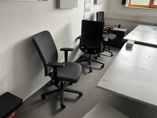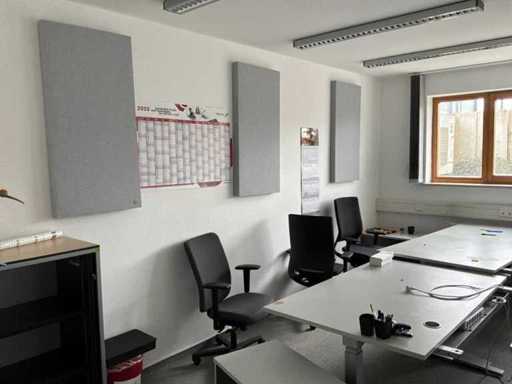 Salut. Composée de : 2 tables réglables en hauteur, 2 tables de 2 000 x 1 000 mm, 2 tables de 1 600 x 1 000 mm, 5 chaises pivotantes de bureau en tissu en noir, 2 buffets de 1 200 mm de haut x 1 200 mm, 6 panneaux acoustiques muraux, 4 boîtes de rouleaux de bureau, 2 porte-vêtements,