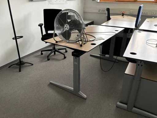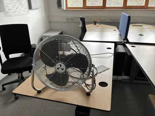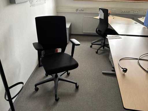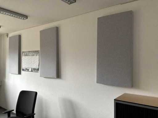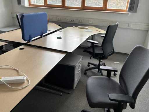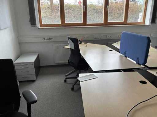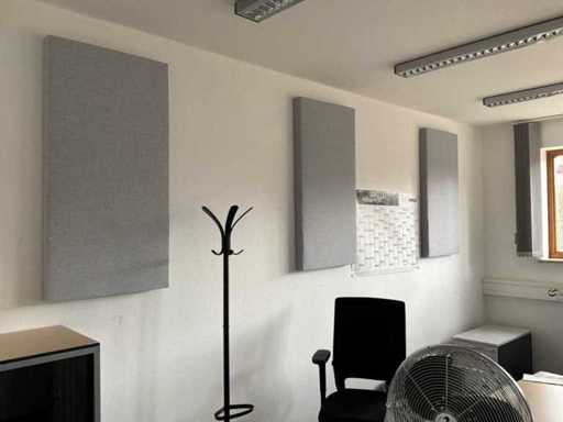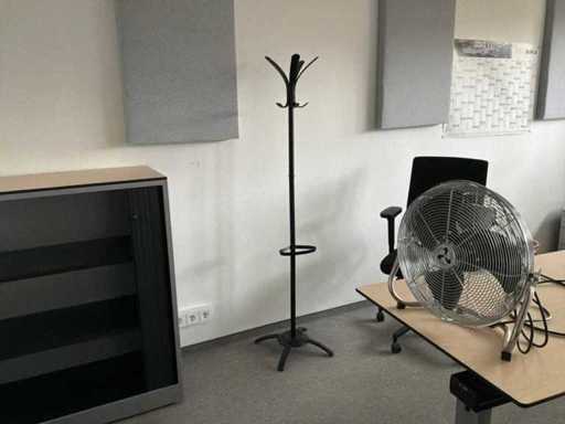Salut. 2 tables de 2000 x 1000 mm, 2 tables de 1 600 x 800, 4 chaises pivotantes de bureau en tissu noir, 2 buffets de 1 200 mm de haut x 1 200 mm, 6 panneaux acoustiques fixés au mur, 4 boîtes de bureau, 1 porte-linge, 1 ventilateur