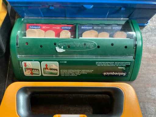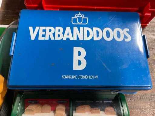AED (26-08-2029) incluant un support, une trousse de protection et des instructions, dont 2 trousses de premiers secours et un plattre.