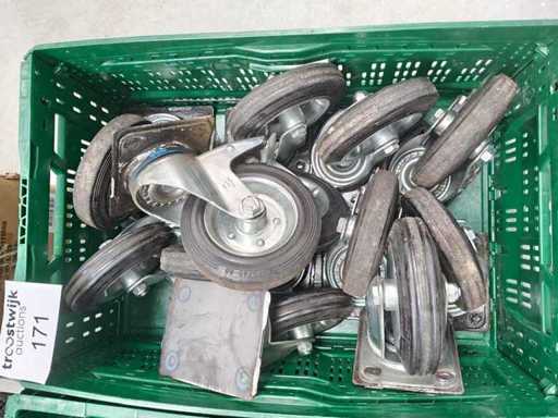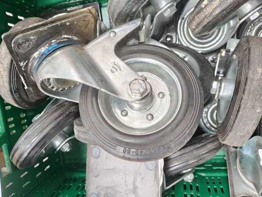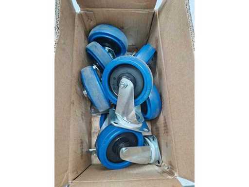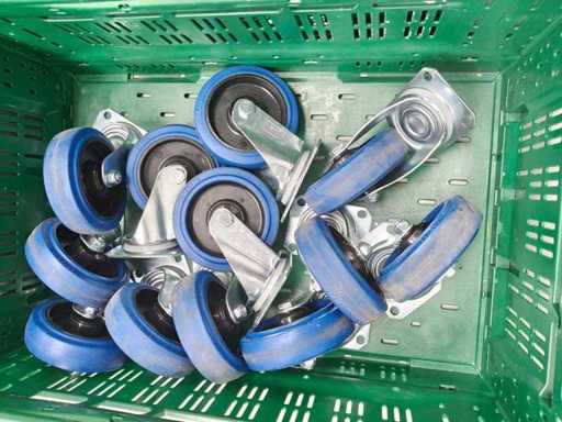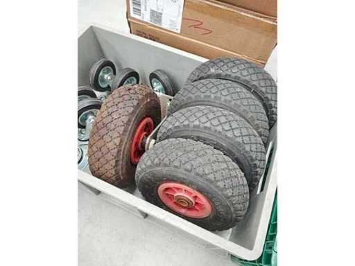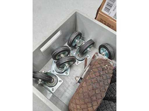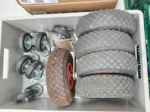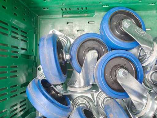 3 boîtes de transport contenant un lot de roues, dont 20 roues pivotantes bleues 125x38 et 12 roues pivotantes 160x40-80 et 6 roues pivotantes 100/30-50 et 5 roues à charrette à main/roues à air