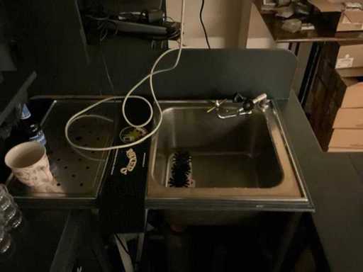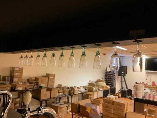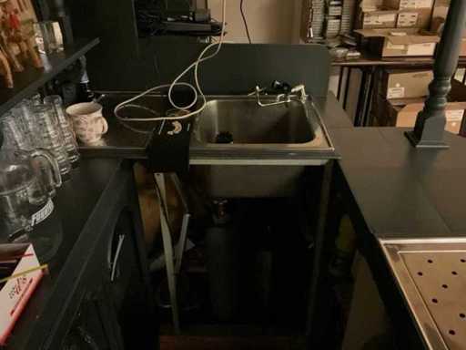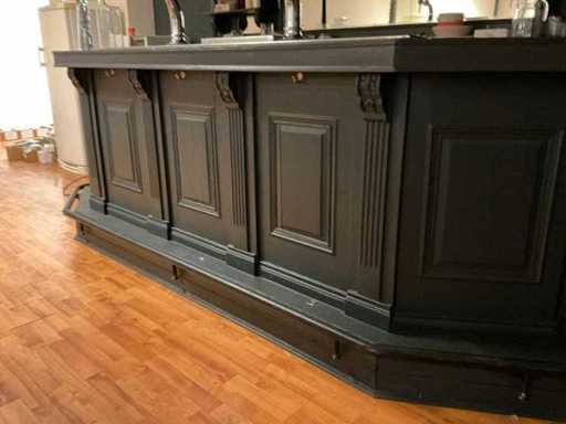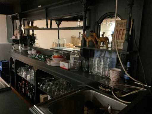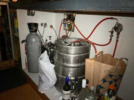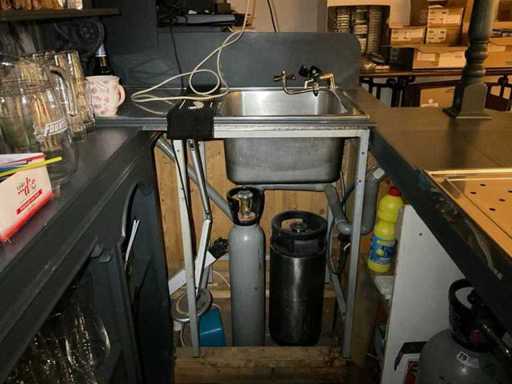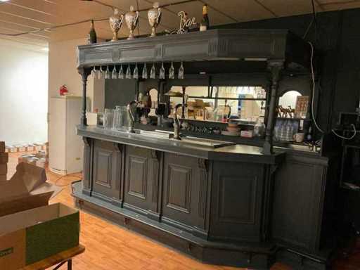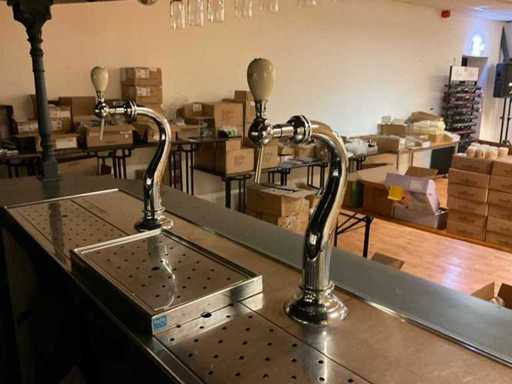U-modèle ; équipée d’un double robinet à bière avec plateau goutte-à-goutte ; évier avec robinet mélangeur et bac goutte-à-goutte ; mur du fond avec miroir ; projecteur ; y compris verrerie et divers