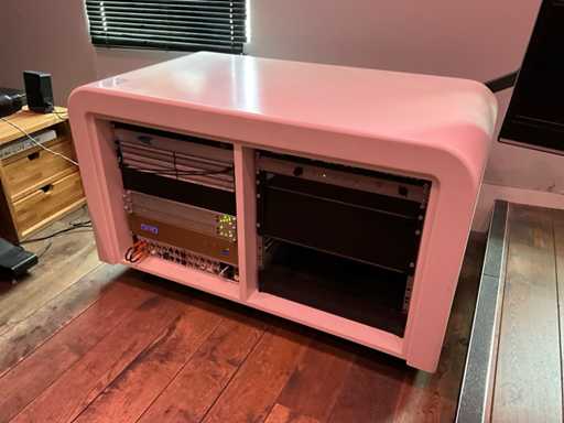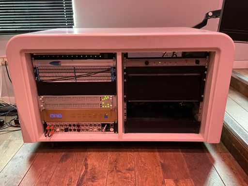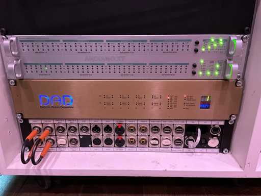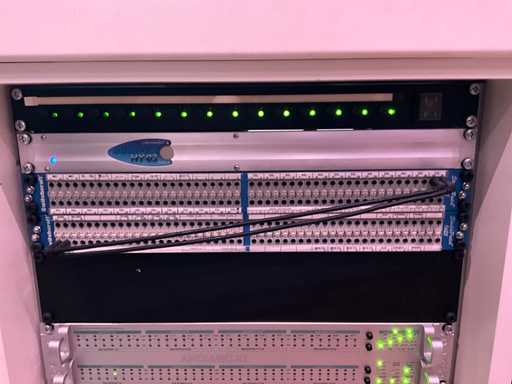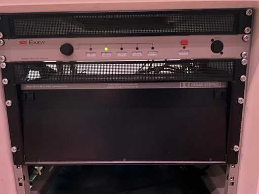 L’équipement comprend : convertisseur DAD AX24, convertisseur AD/DA et AES Andiamo 32 canaux MADI, 2x Switchcraft StudioPatch 9625, téléphone Sonifex HY-03 hybride, Dolby Stereo Model DS4-E MKII, contrôle de configuration du système Exigy, 8x haut-parleurs Exigy C18S, 3x haut-parleur Exigy MHS 1, 3x haut-parleur Exigy S212 et 2x haut-parleur Exigy S115, téléviseur sony non présent.
