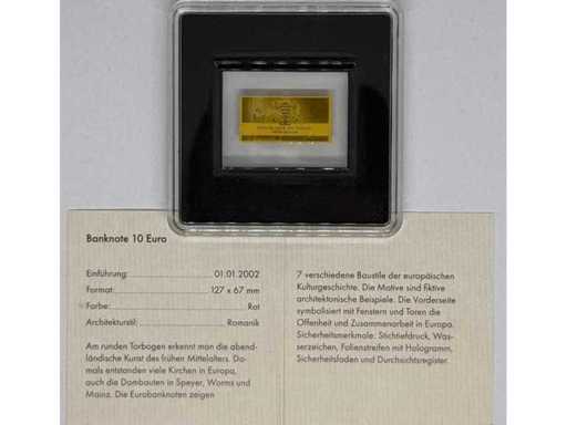 Or 999 (1/1000 oz) – Lingot miniature d’or de 10 euros (design série Euro, République du Tchad), 19,72 × 10 mm.