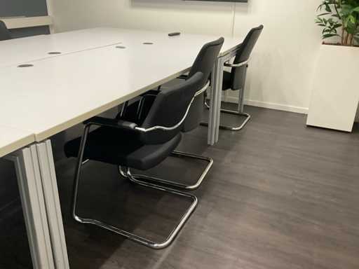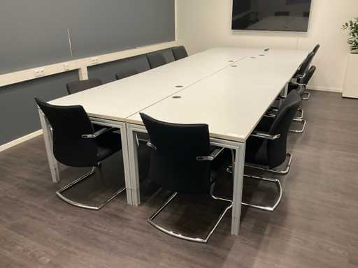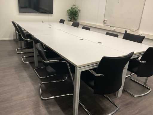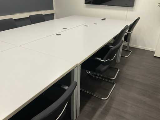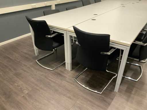 composé de (5x) tables de conférence ; Sombre. environ 180x90 cm ; (11 fois) président de conférence ; Y compris un tableau blanc et un bac